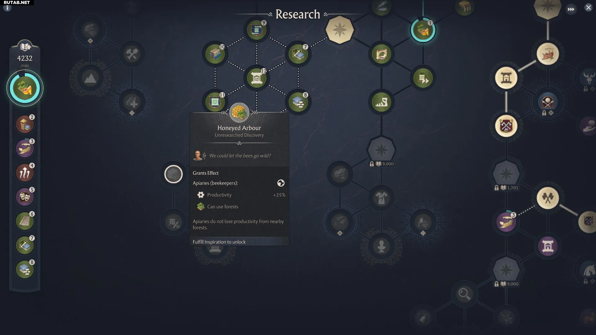 Некоторые исследования также позволяют зданиям получать выгоду от лесов, например «Медовая роща», которая разрешает строить «Пасеки» вокруг лесов, а не только на лугах.