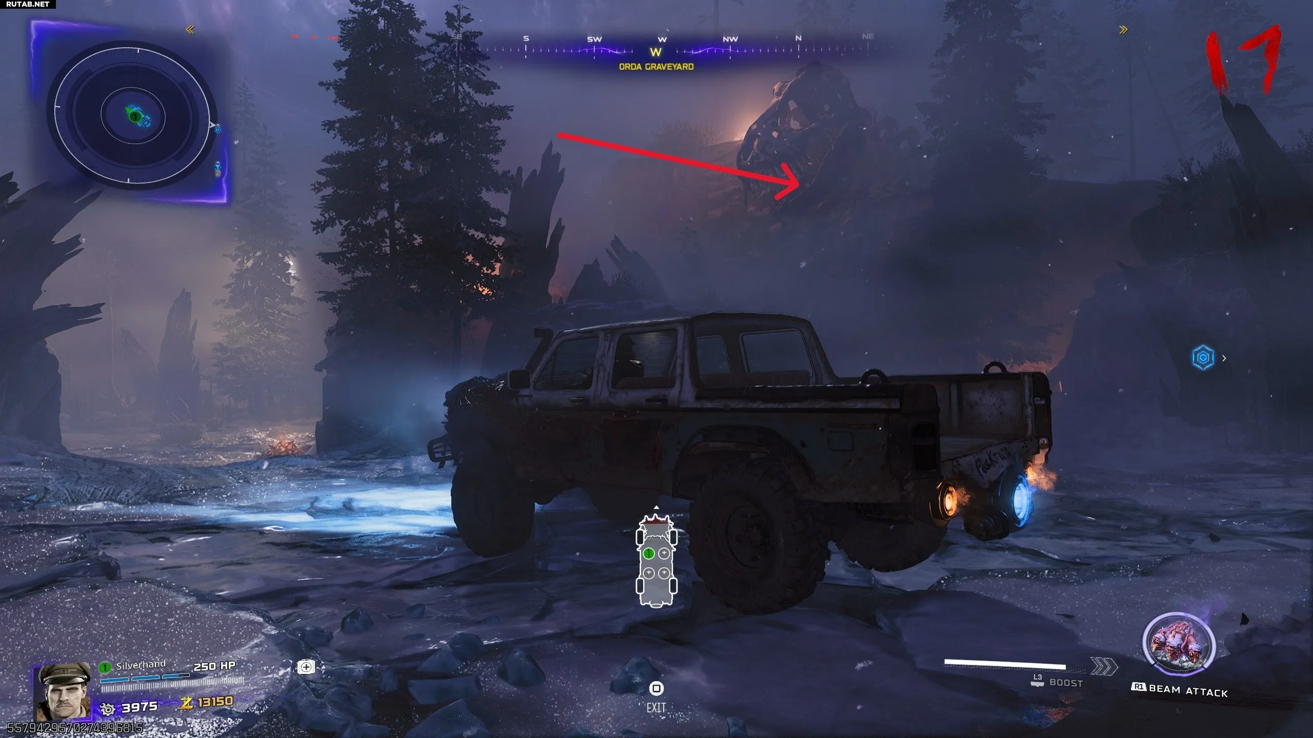 - За черепом тираннозавра на земле при выходе из Эшвуда (смотреть на юг)