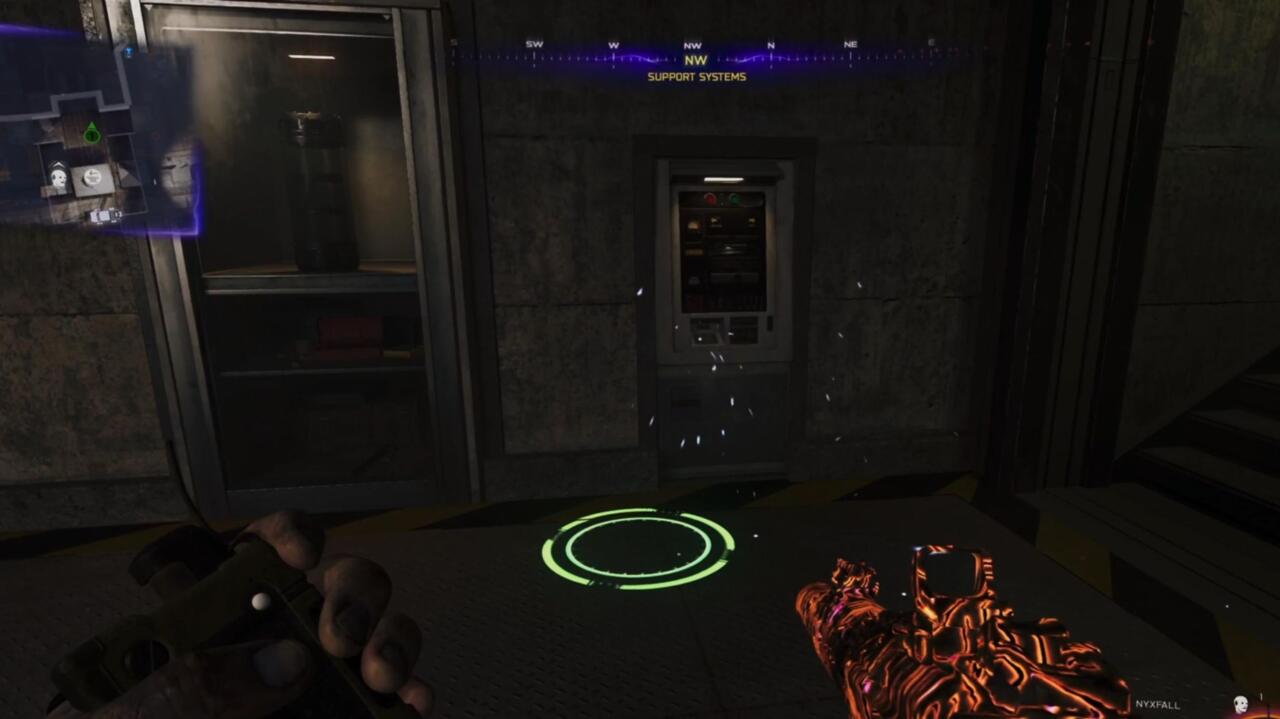 Двигайтесь прямо, затем сверните направо, где вы увидите рампу, ведущую вниз к большой двери. Откройте её, чтобы получить доступ к зоне «Системы поддержки» на карте, и прикажите Клаусу встать у сломанного терминала в стене.