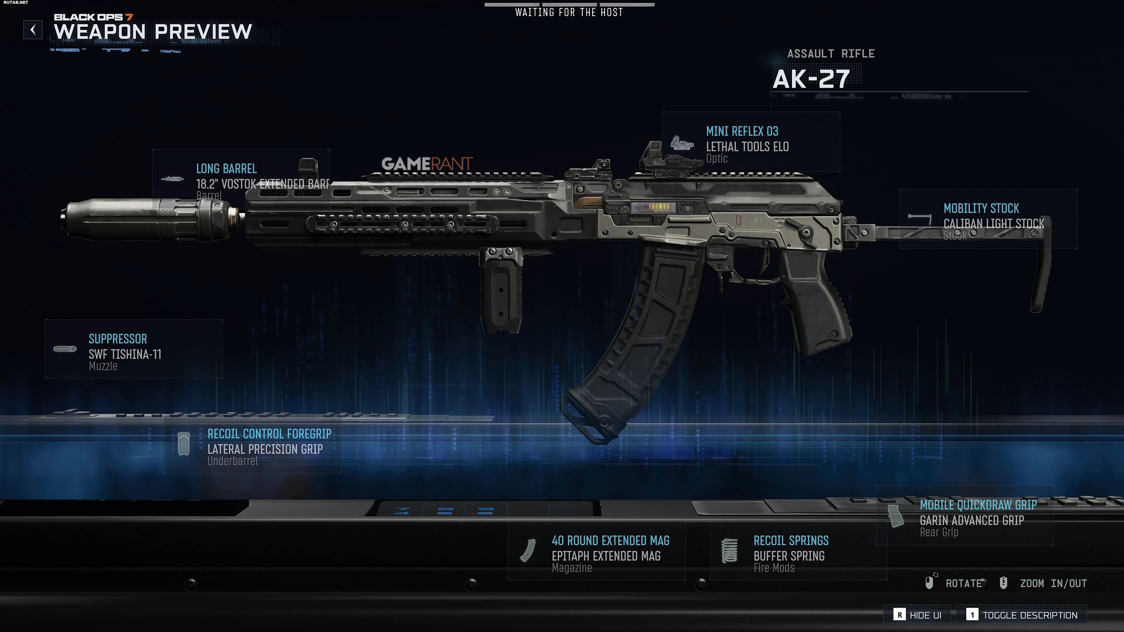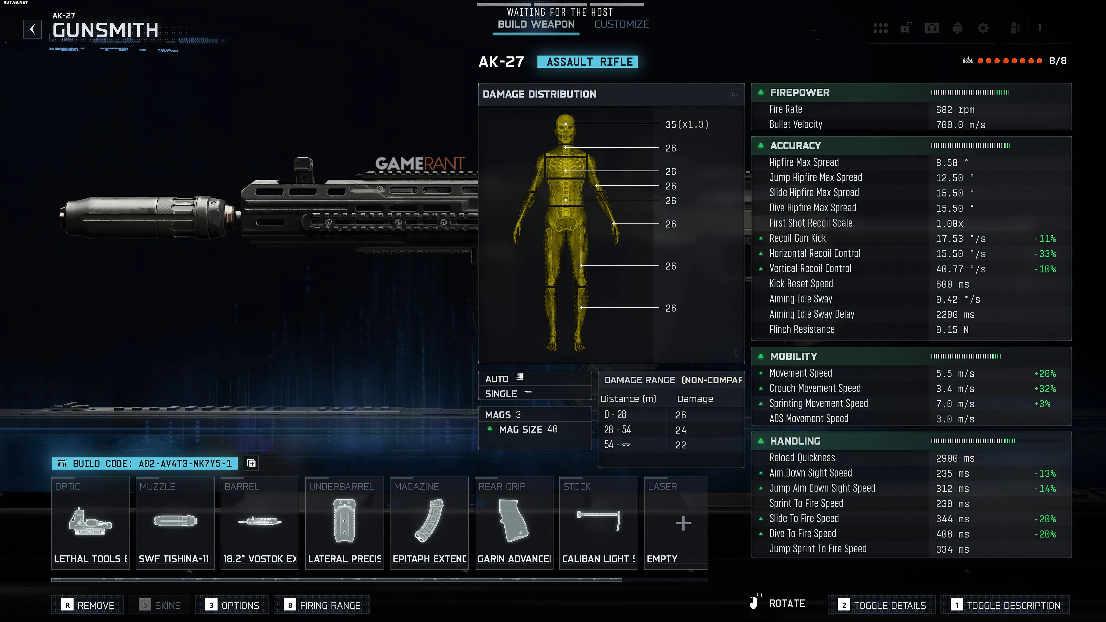 Данная сборка фокусируется на улучшении контроля горизонтальной отдачи, поскольку вертикальная отдача у AK-27 и так низкая. Дальность урона также увеличена, чтобы оружие оставалось конкурентоспособным на дистанции до 38 метров и дальше, позволяя ему соперничать с такими вариантами, как MXR-17.