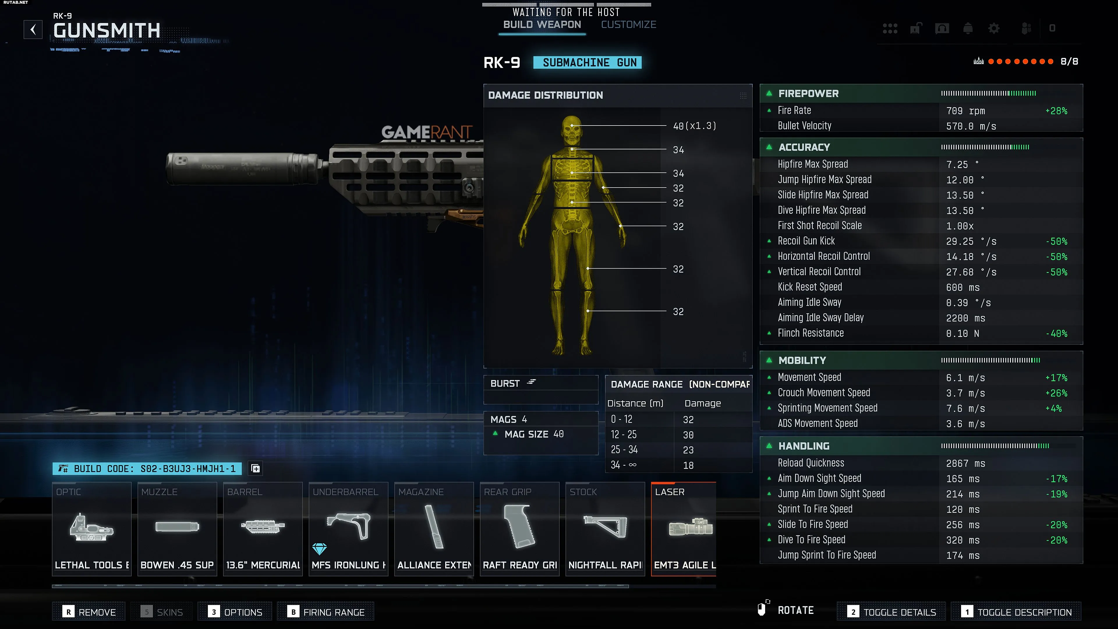 Данная сборка в основном сосредоточена на увеличении эффективной дальности оружия до 12 метров, что позволяет ему оставаться конкурентоспособным в рамках меты ближнего боя. Игроки также могут заметить, что функция автоматической стрельбы очередью удалена, на этот раз в пользу столь необходимого увеличения скорострельности для ещё более быстрого потенциального TTK для тех, у кого быстрый палец.