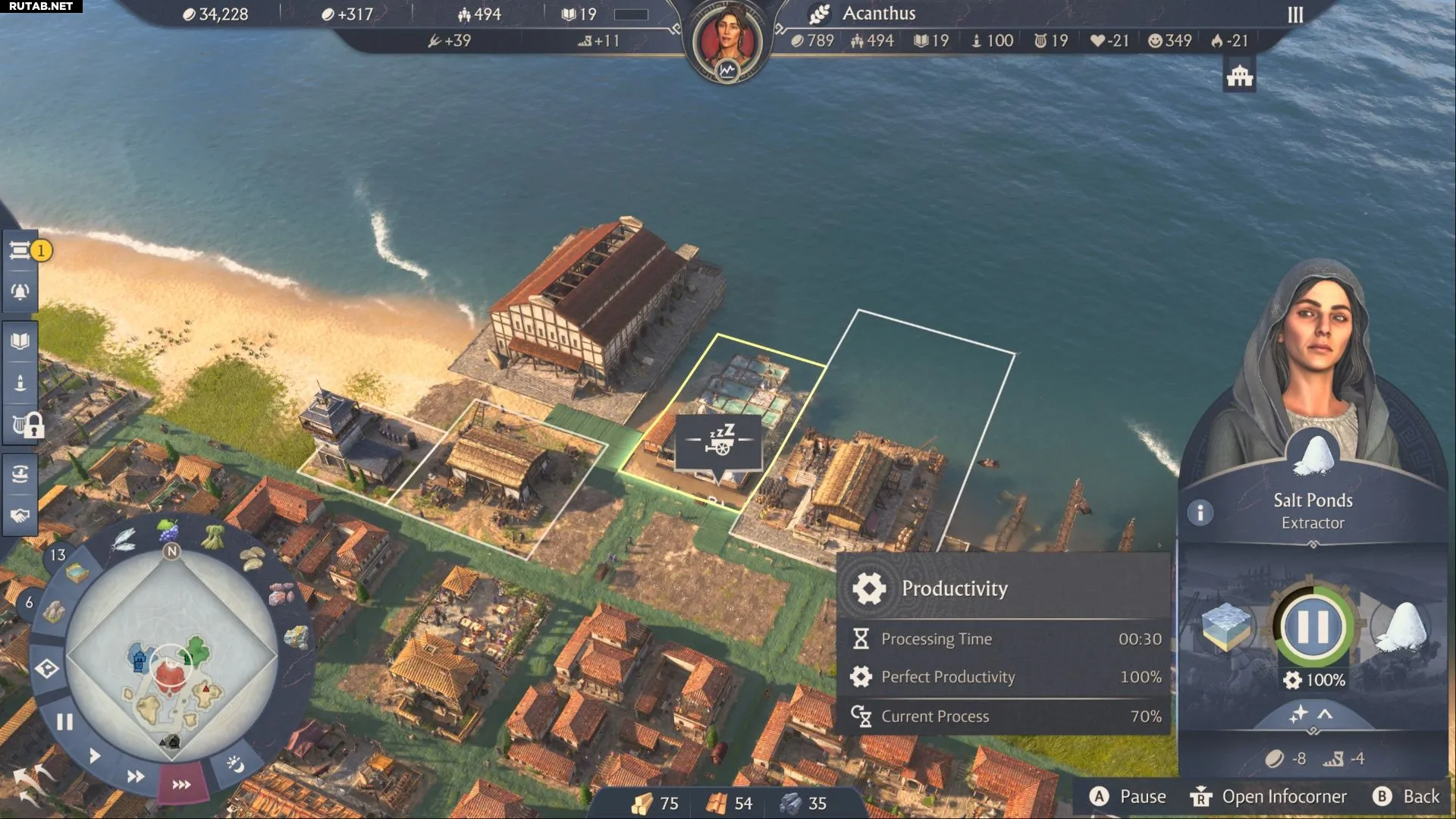 Соляной пруд производит 1 единицу соли каждые 30 секунд, тогда как Хижине скумбрии требуется 60 секунд для производства 1 единицы скумбрии. Гарумное производство обрабатывает 1 единицу гарума за 90 секунд. Для идеально эффективной производственной цепи игрокам потребуется построить 1 Соляной пруд, 2 Хижины скумбрии и 3 Гарумных производства.