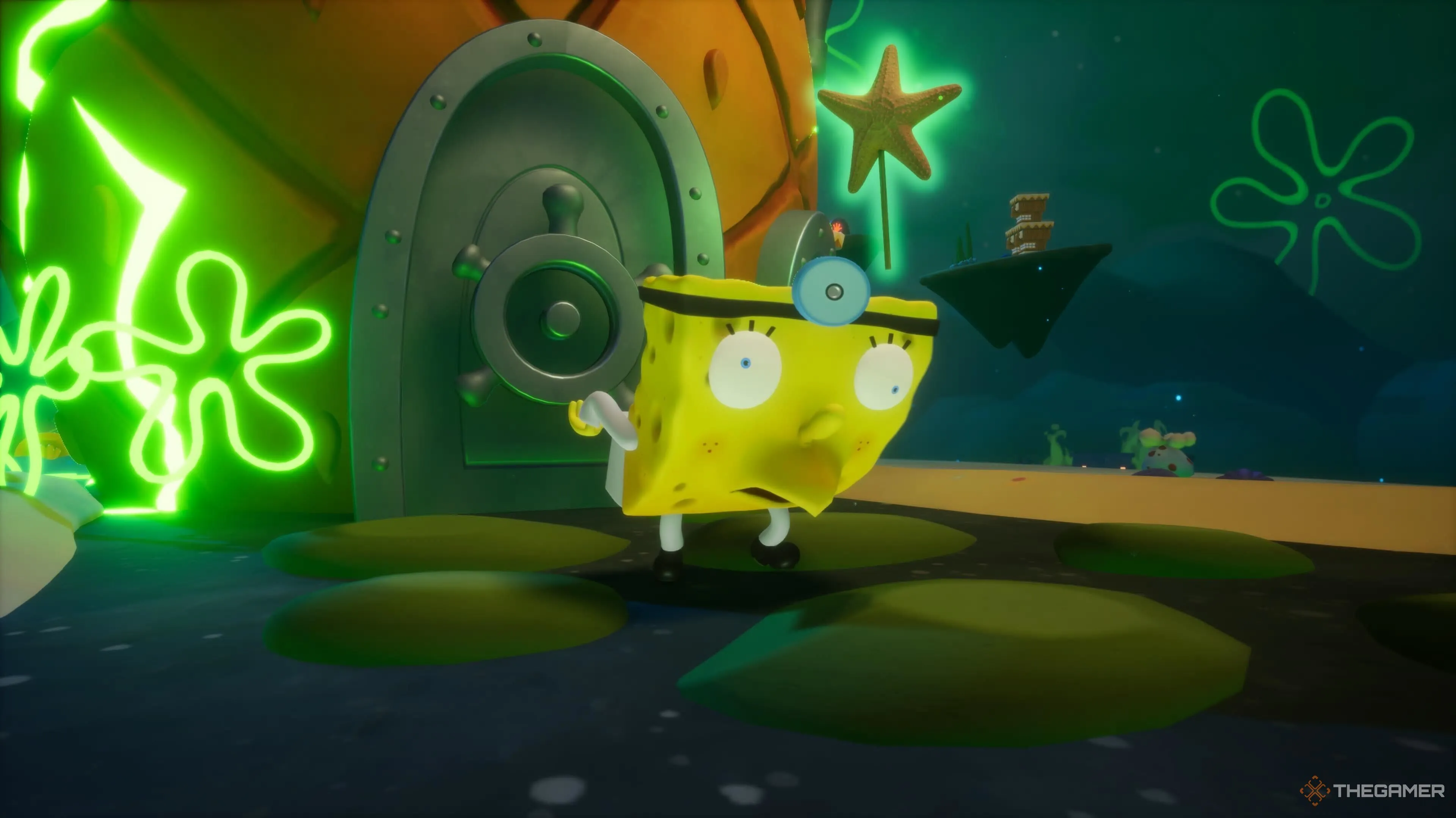 Один из лучших костюмов требует много усилий. Каменные очки требуют прохождения всех пяти уровней испытаний Планктона, то есть сбора всех сундуков в игре. |