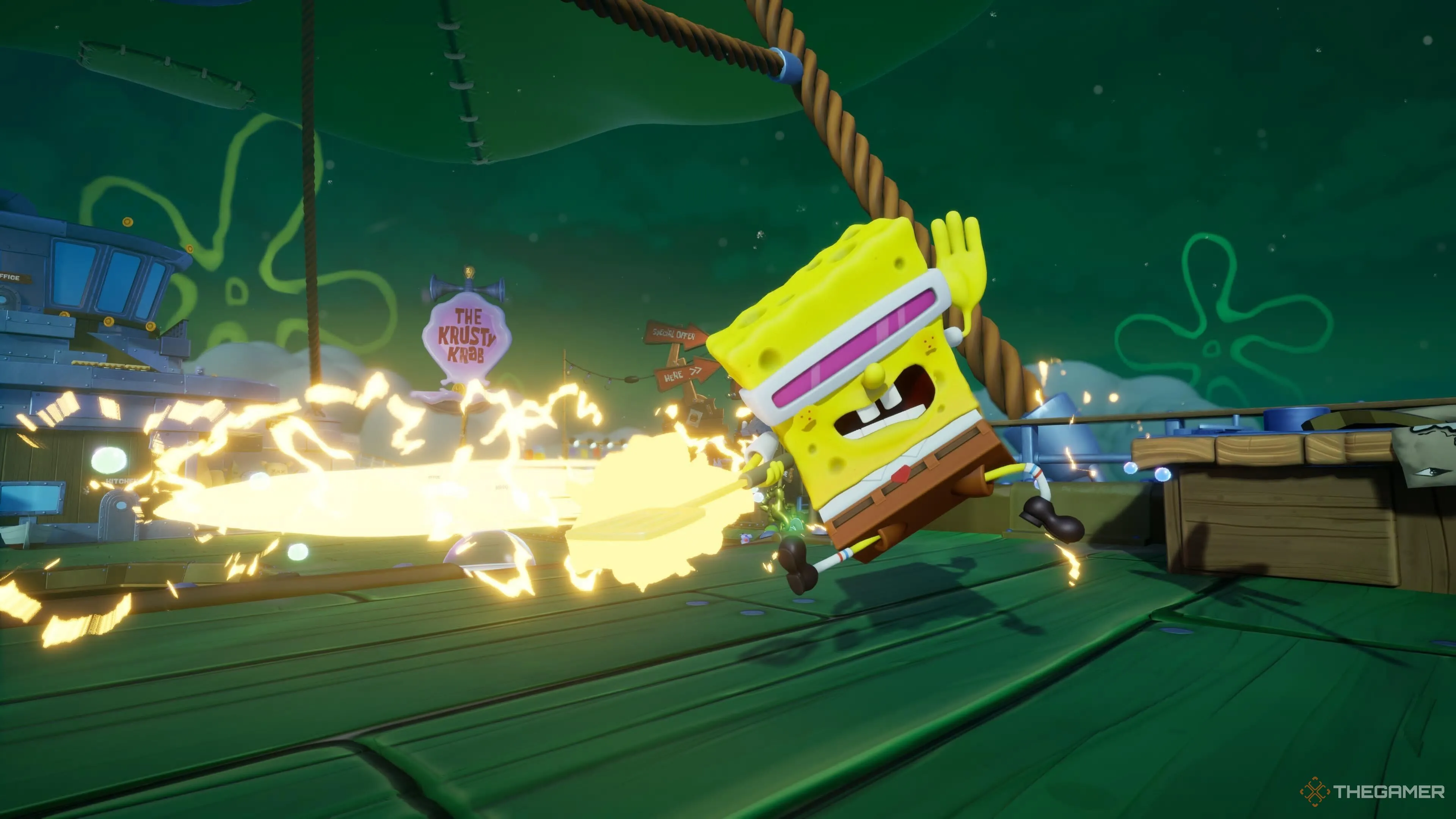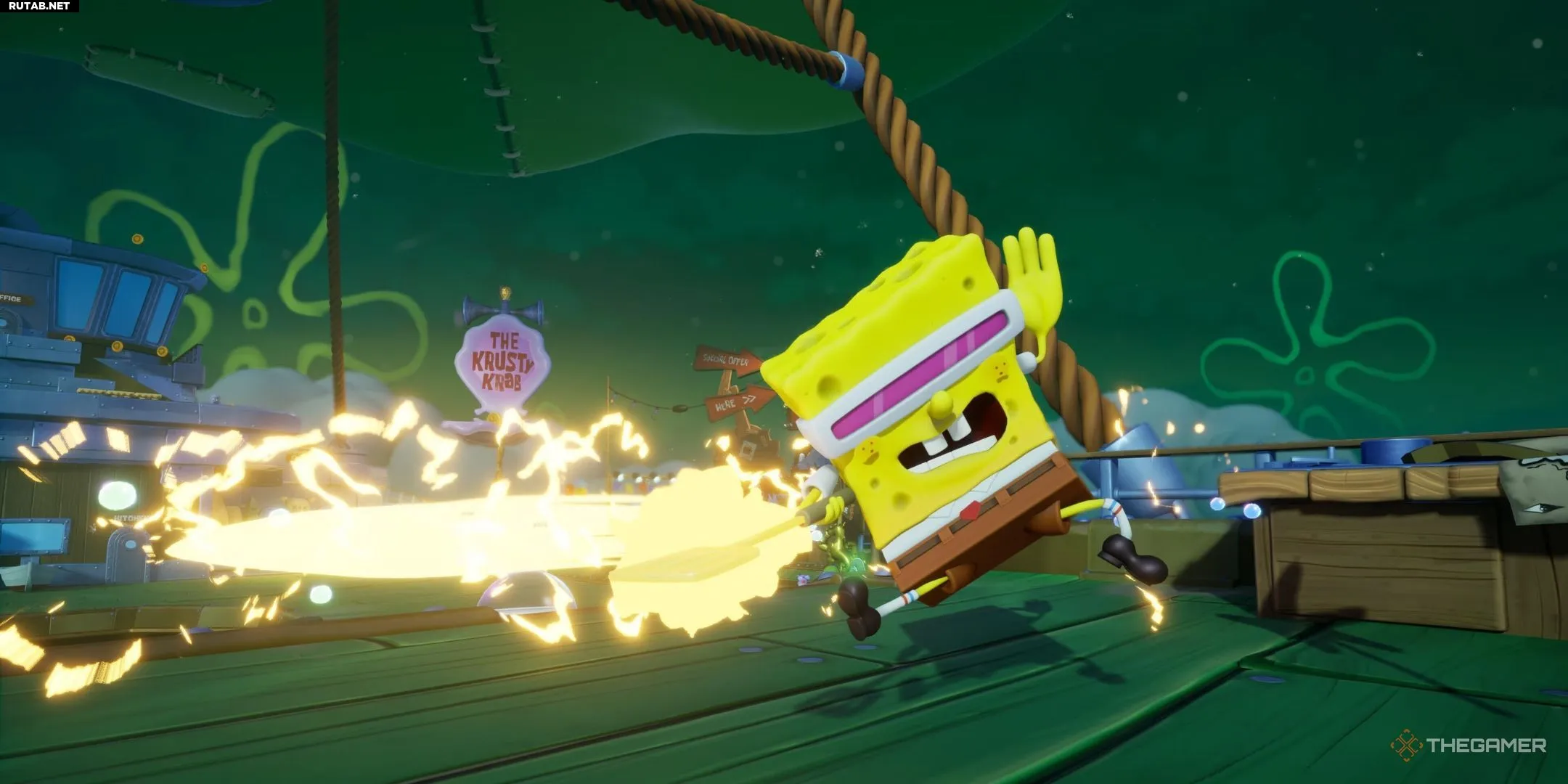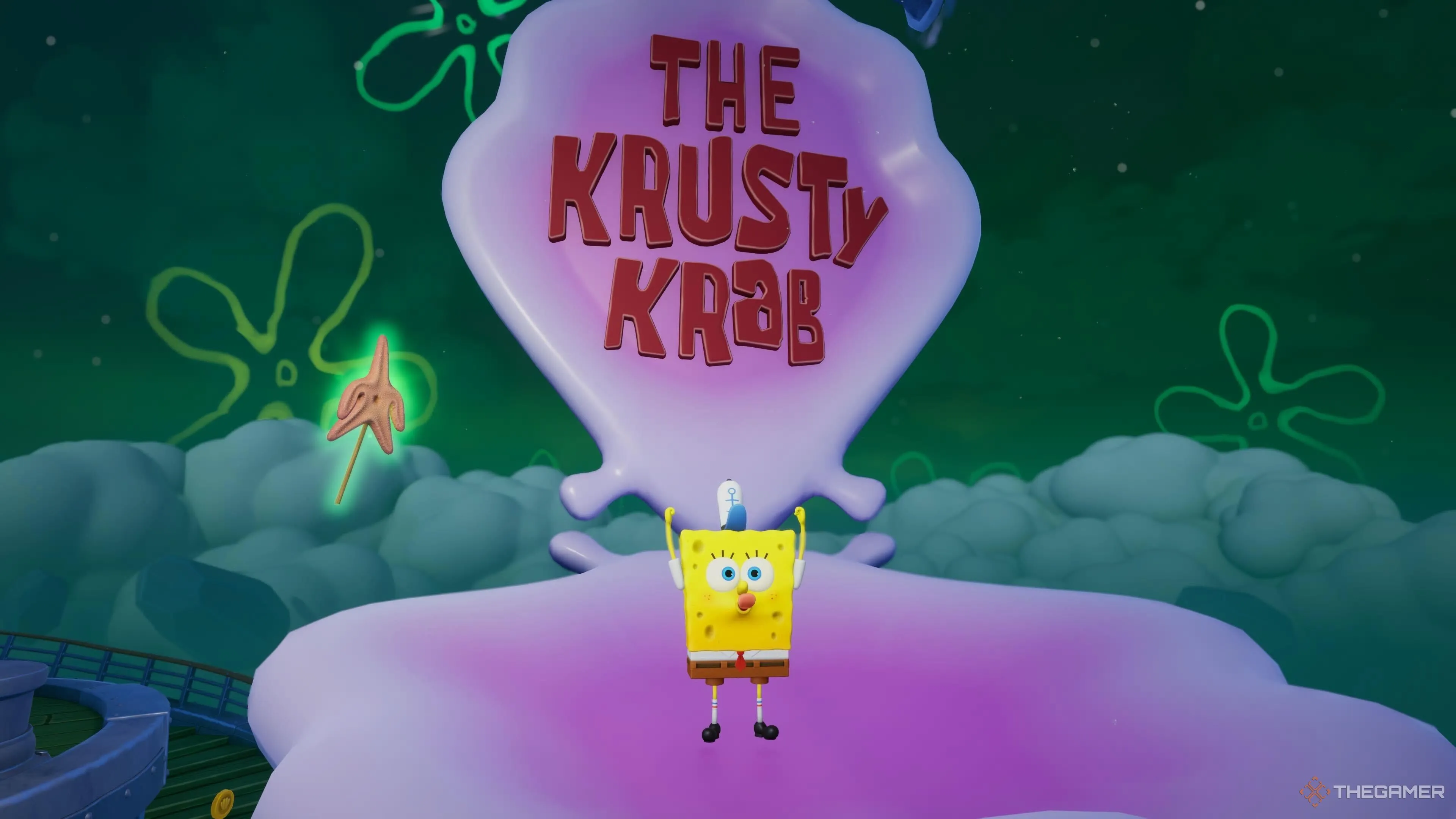 Чтобы получить фирменную форму Красти Крабс, зайдите на кухню Летающего Красти Крабс и взаимодействуйте с грилем для мини-игры с Крабсбургерами. Приготовьте не менее 300 бургеров, и костюм можно будет купить за 100 золотых. |