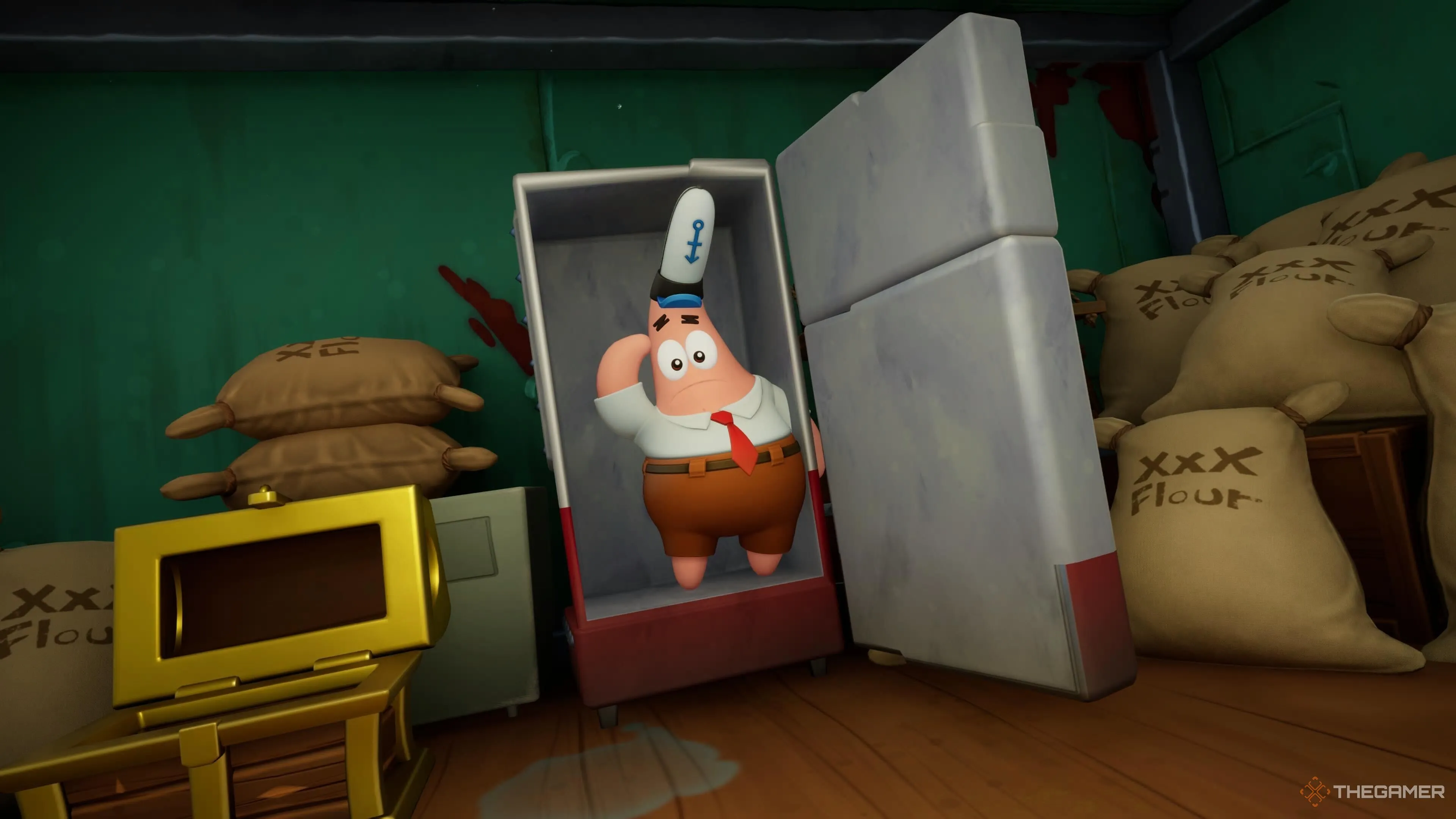 Первый костюм Патрика разблокируется легко — просто поговорите с Перл на Летающем Пэтти за Патрика. После этого можно купить «Копию месяца» за 100 золотых. |