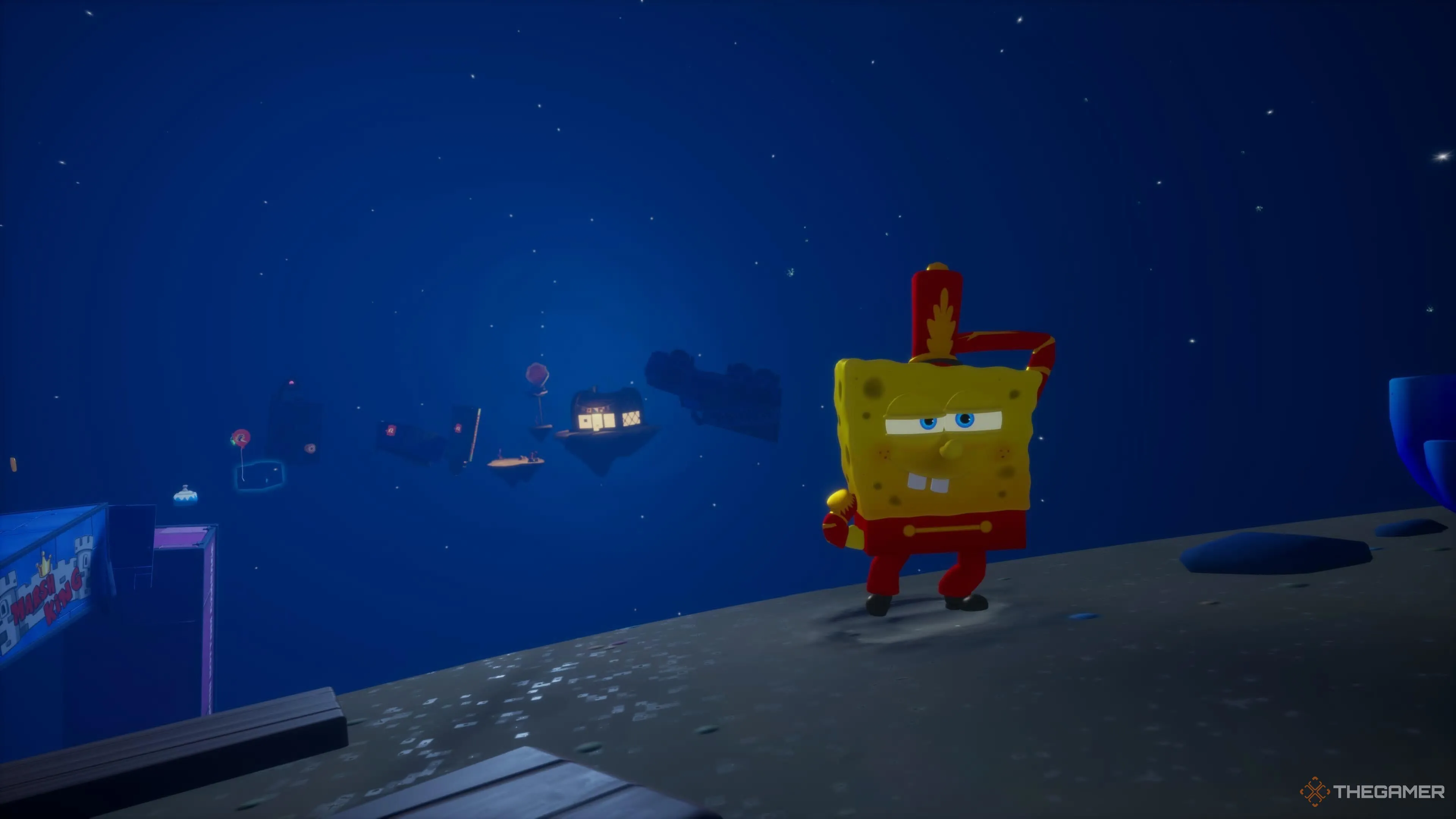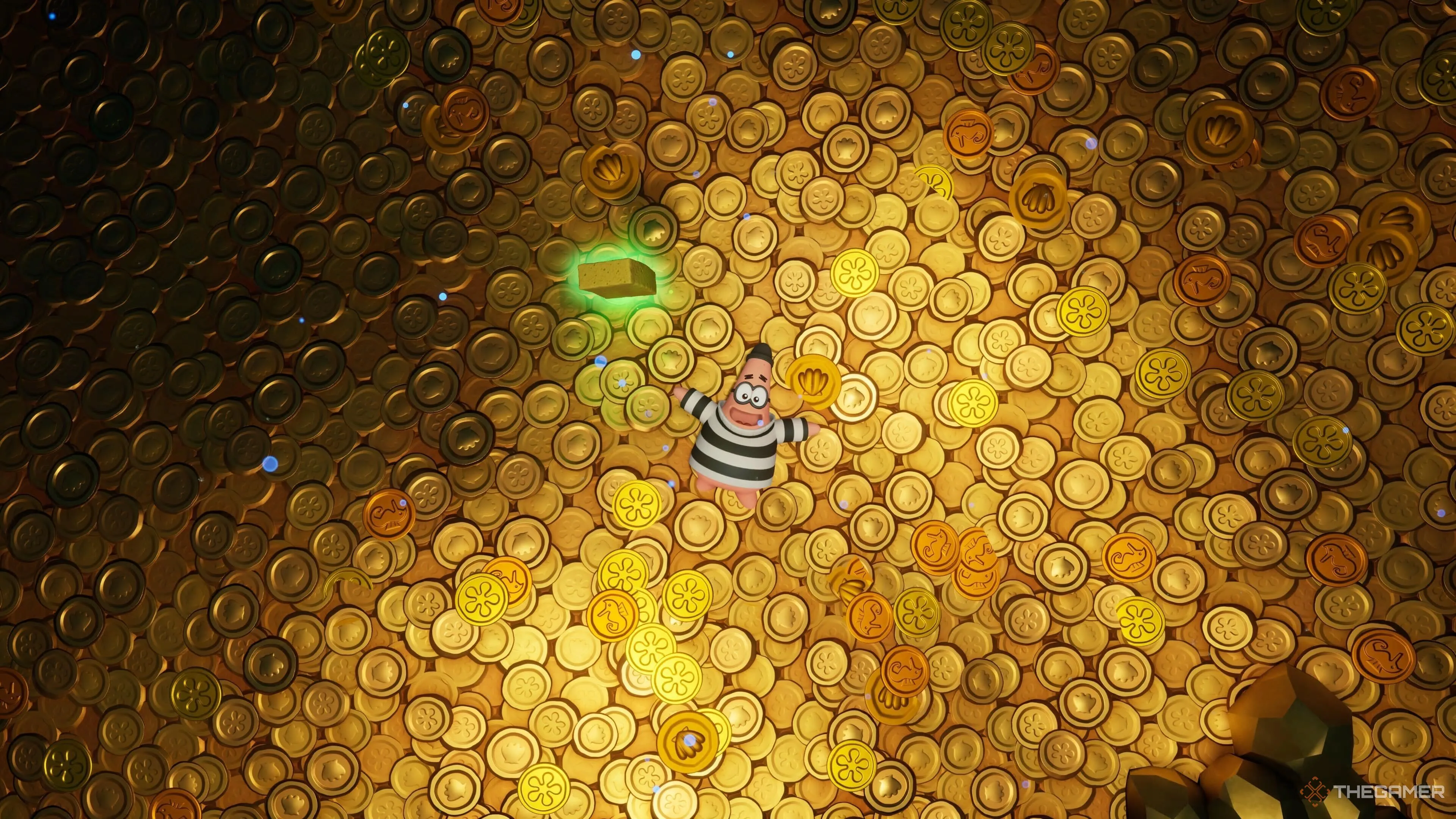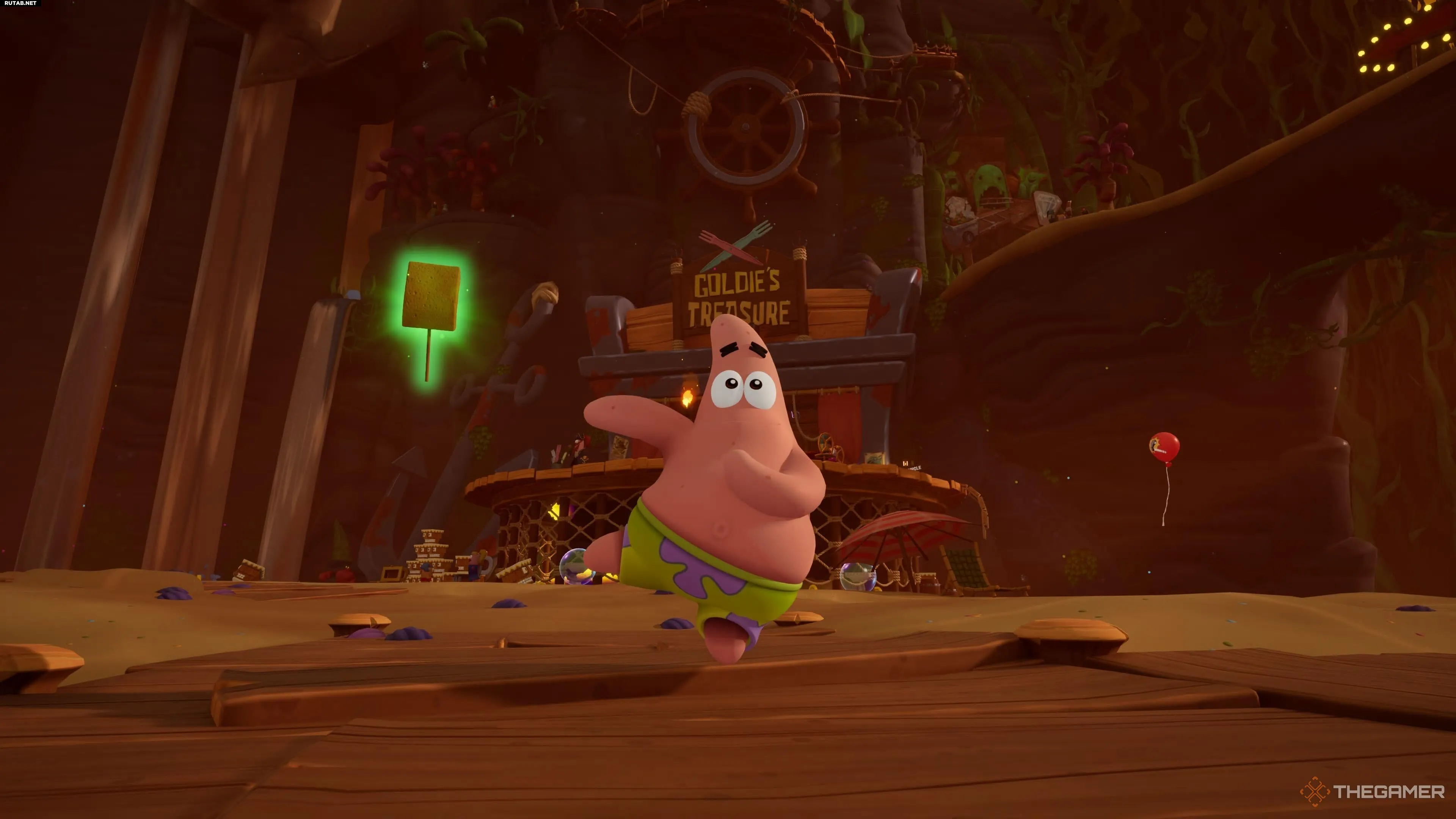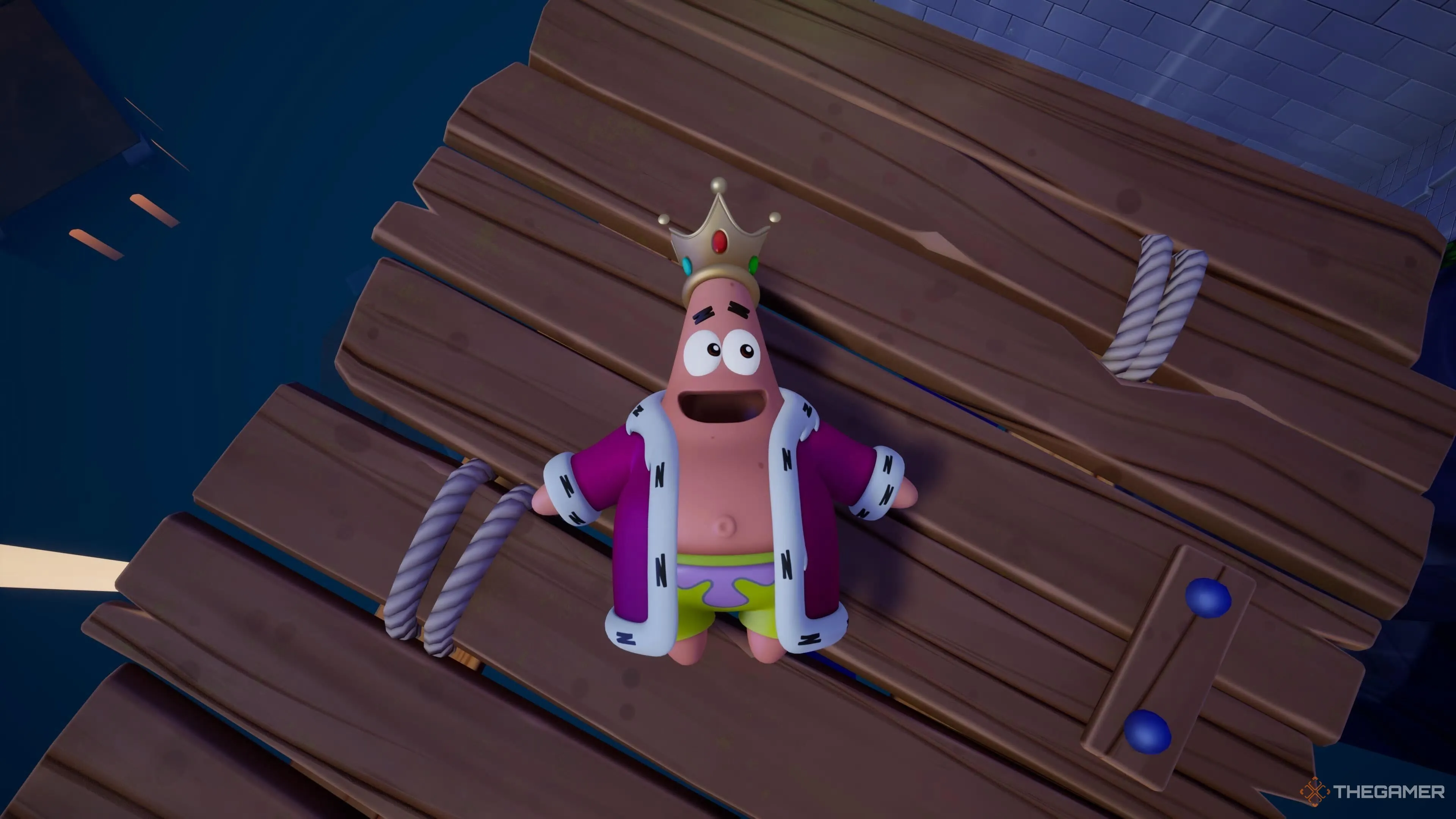 Чтобы разблокировать «Короля Патрика», нужно лопнуть все золотые шарики ударом карате Губки Боба по всей игре. После этого костюм можно купить за 1250 золотых. |