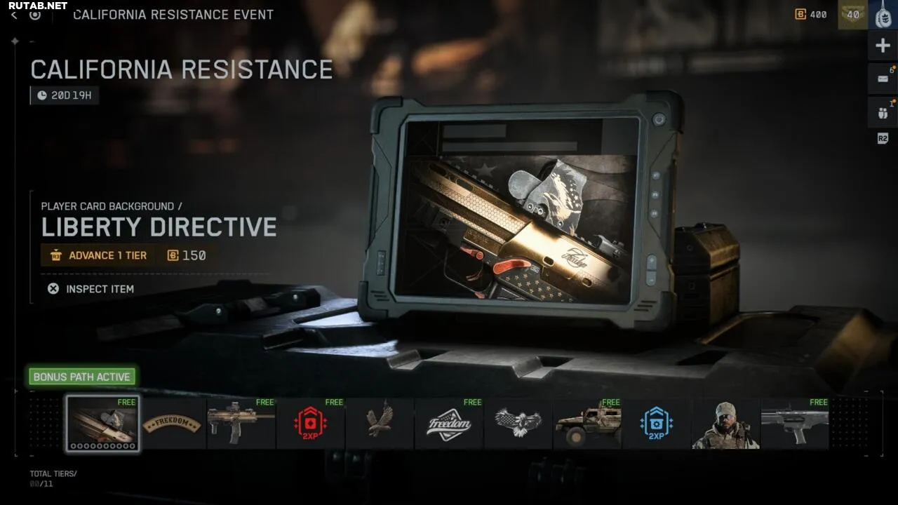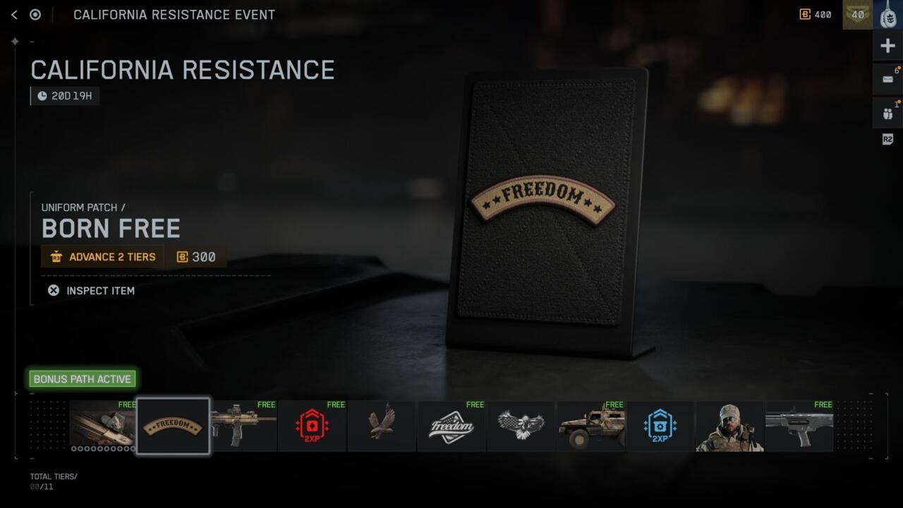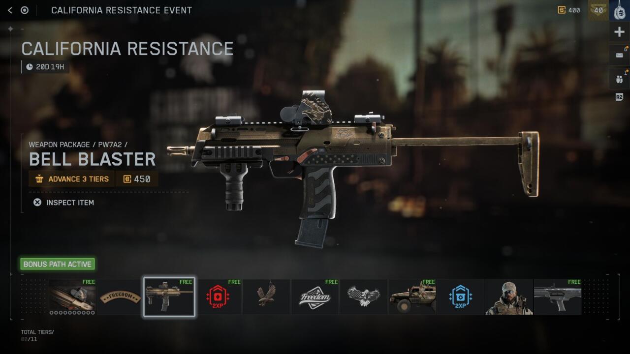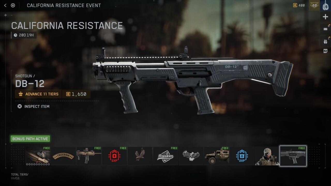 Пропуск события «California Resistance» находится во вкладке боевого пропуска, но не заменяет основной пропуск 1-го сезона. Всего в нём 11 уровней с бесплатными и премиум-наградами. Шесть из них, включая новое дробовик DB-12, доступны всем игрокам.