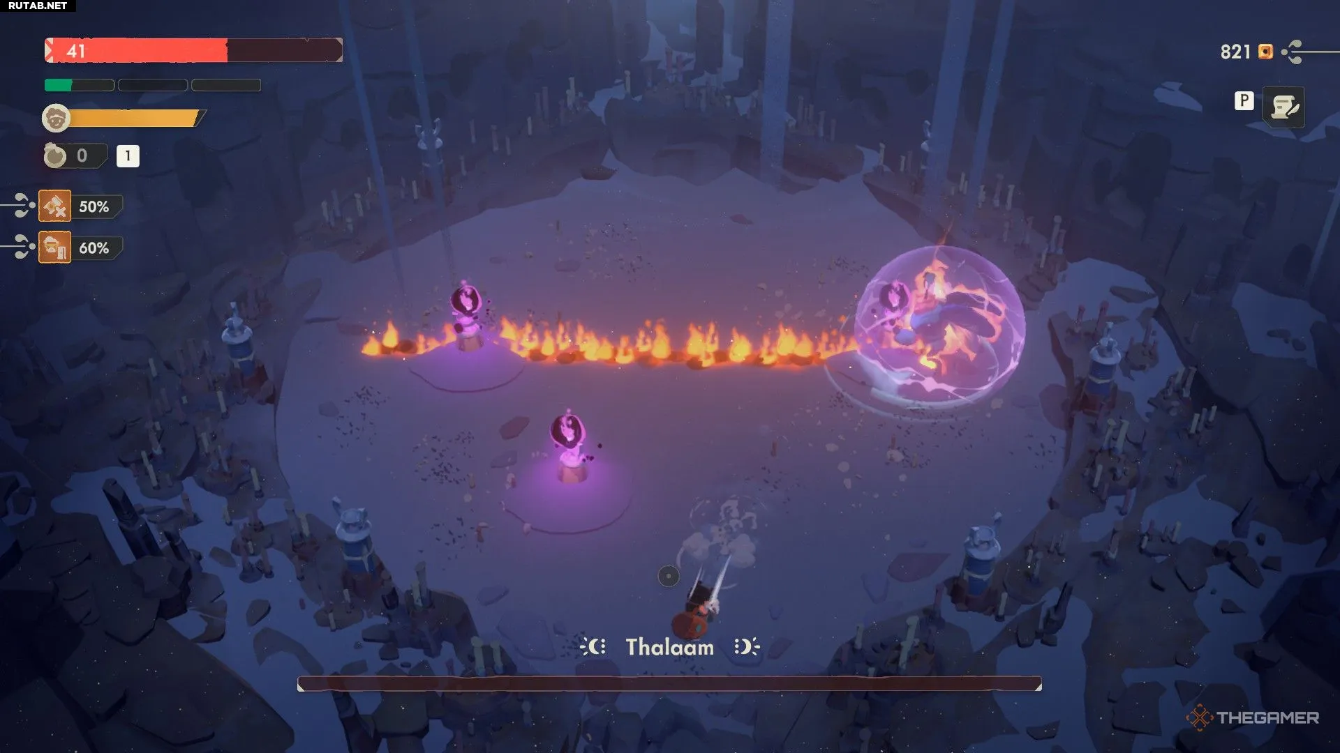 Вокруг него появятся небольшие фиолетовые снаряды, которые нужно уничтожить, а затем бросить в Талаама, чтобы нанести урон его щиту.