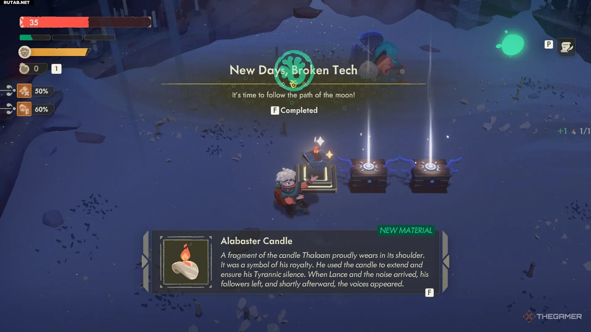 Одолейте Талаама, и вы получите два сундука и Алебастровую свечу, что позволит выполнить задание кузнеца «Новые дни, сломанные технологии». Из этого материала можно создать новое оружие — «Балладу Солнца и Луны».