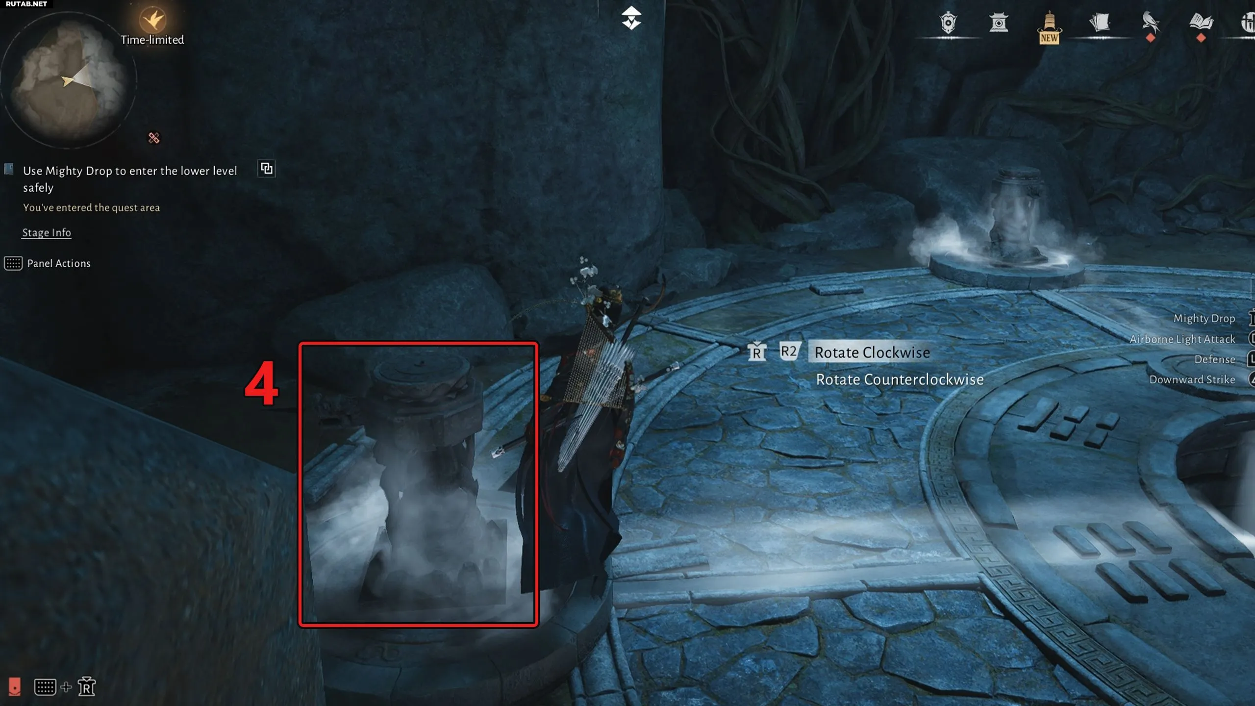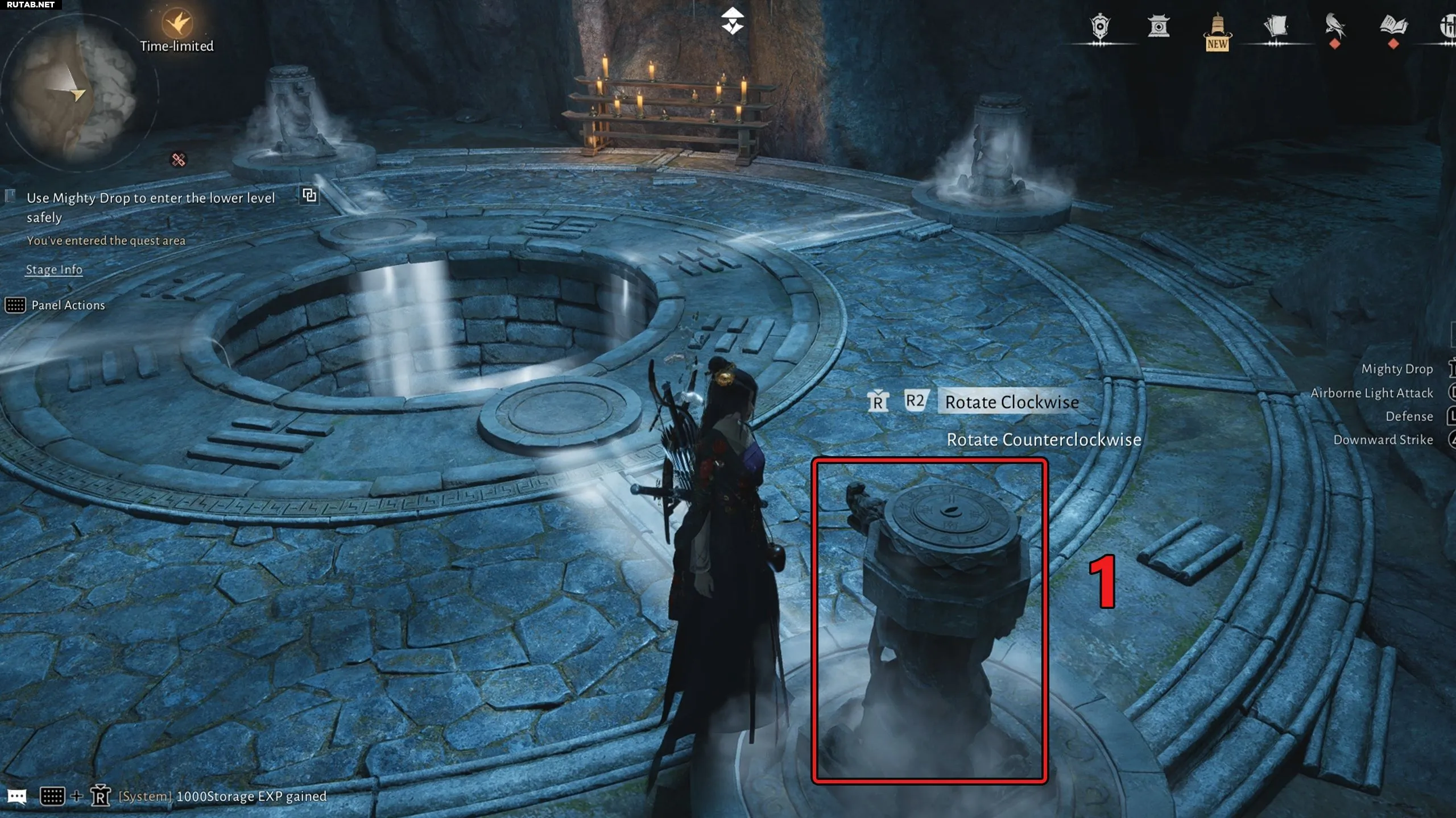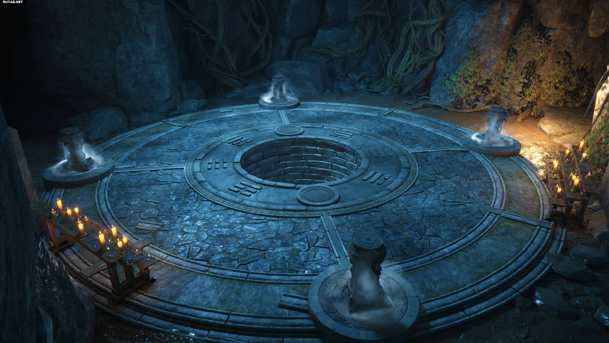 Поверните механизм между полками со свечами (2) один раз против часовой стрелки, затем механизм напротив (1) — два раза по часовой стрелке. Эти механизмы представляют огонь и воду. Еще раз поверните инь-ян диск, чтобы завершить головоломку и открыть путь вниз.