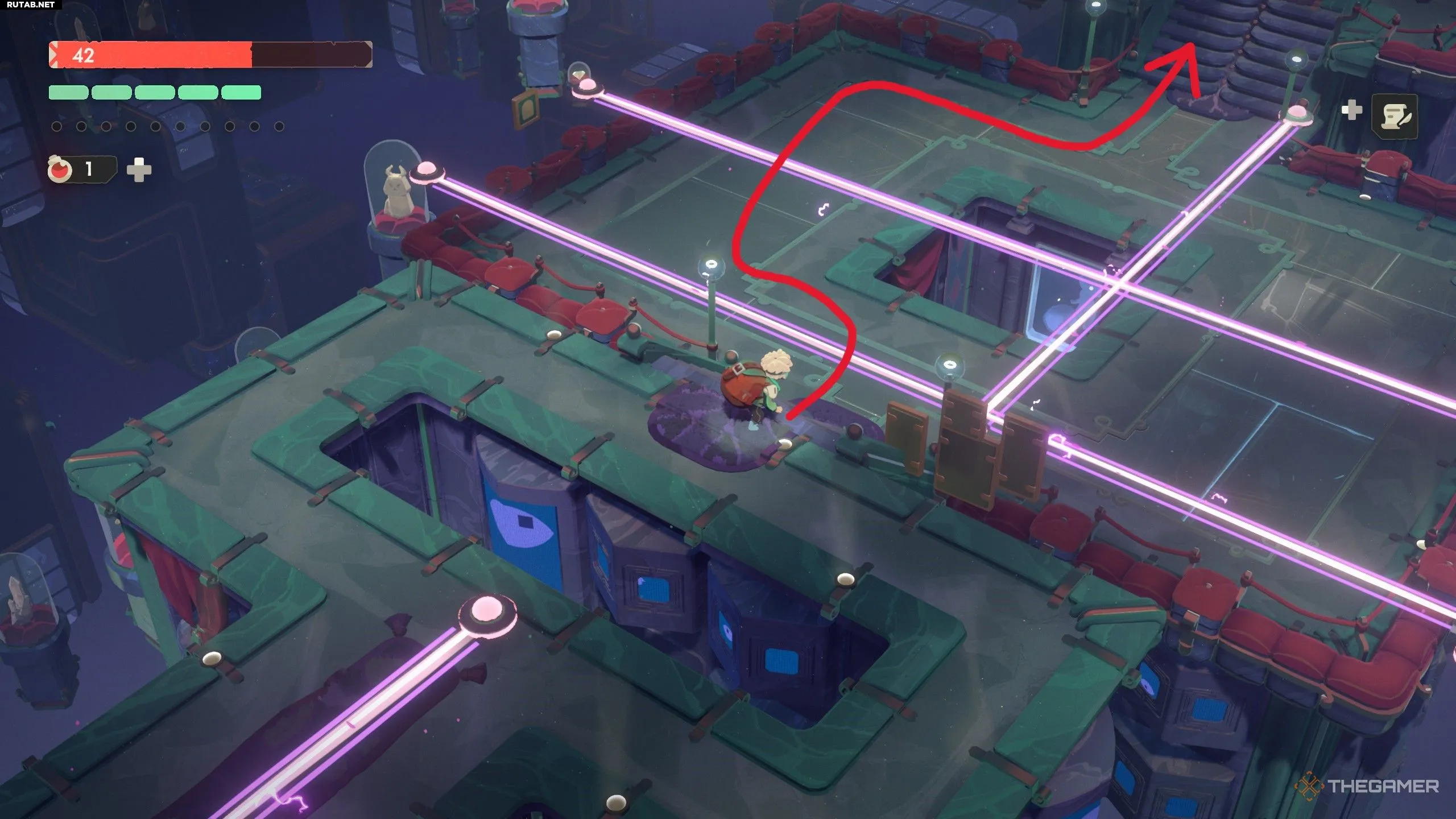 На последнем участке дождитесь, когда оба луча окажутся с одной стороны комнаты. Пробегите по противоположной стороне и перекатитесь через вертикальные лучи. Это минимизирует количество лучей, которые нужно пересечь.