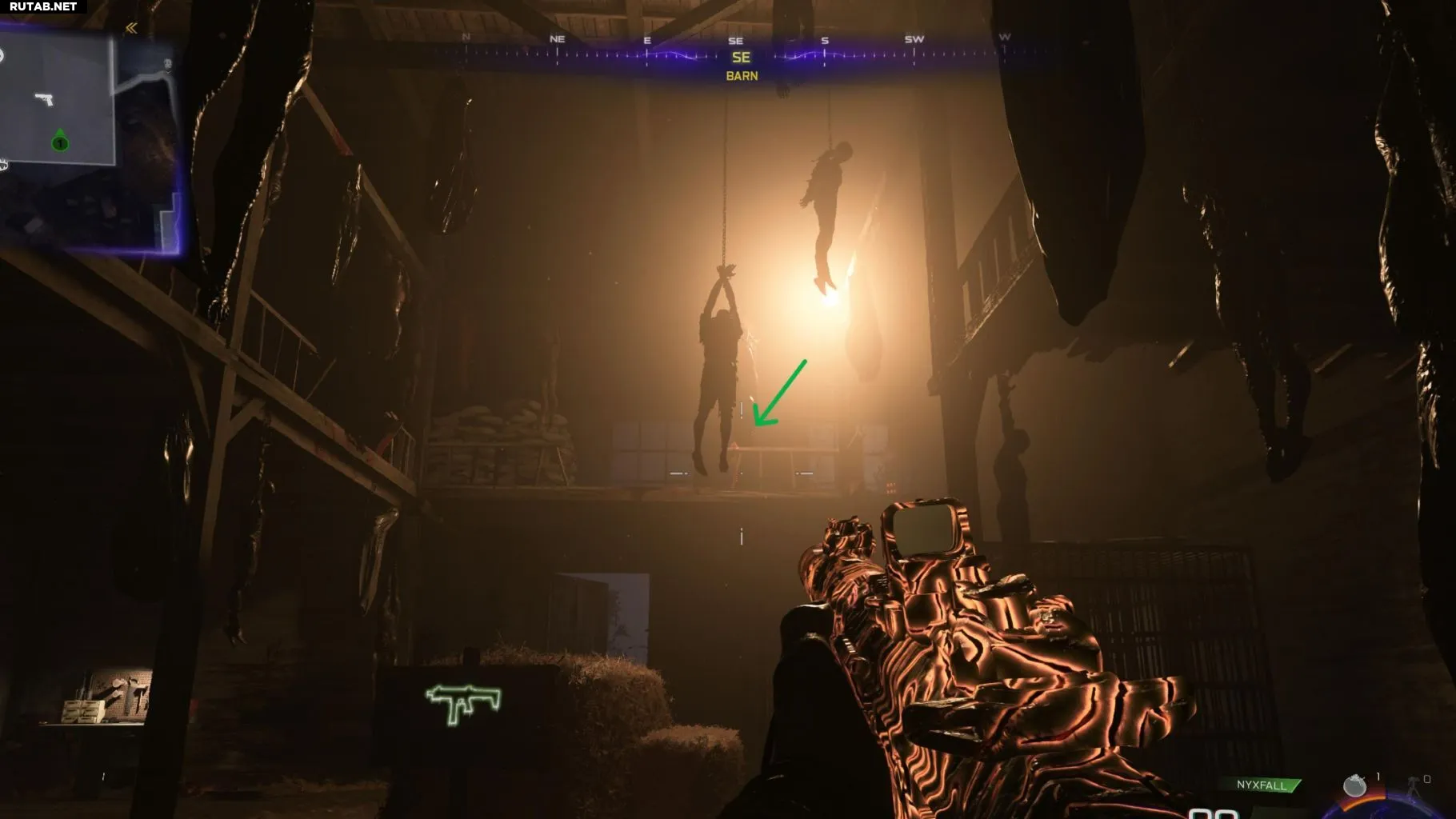 Используйте метательный топор на ноге тела, висящего на стропилах амбара. Цельтесь в первое тело, висящее посередине, прямо над тюками сена.