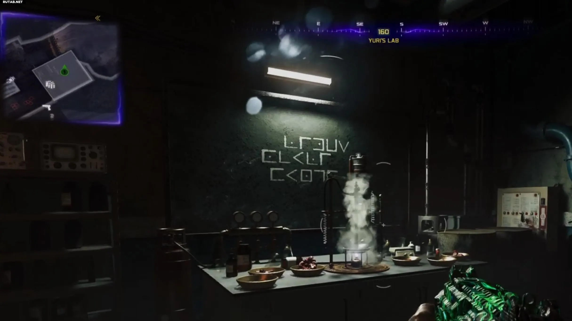 Направляйтесь в Лабораторию Юрия в Заря Космодроме. Она находится за металлическими дверями складского помещения, расположенными напротив двери, которую вы открывали для зоны систем поддержки на карте, где вы приказывали Клаусу помочь получить канистру для перчатки Некрожидкости.