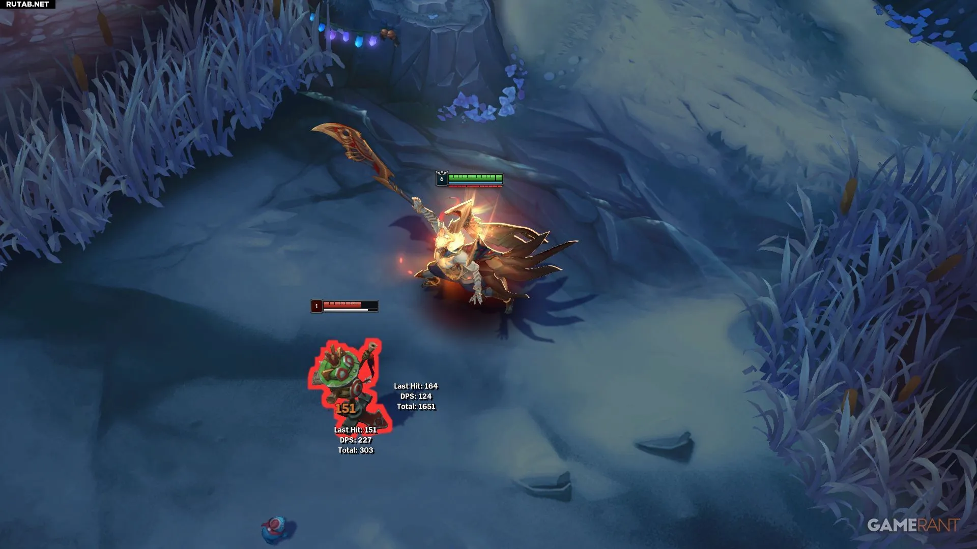 Затем он наносит удар вниз, нанося физический урон и восстанавливая 33% от нанесённого урона вражеским чемпионам в виде здоровья.