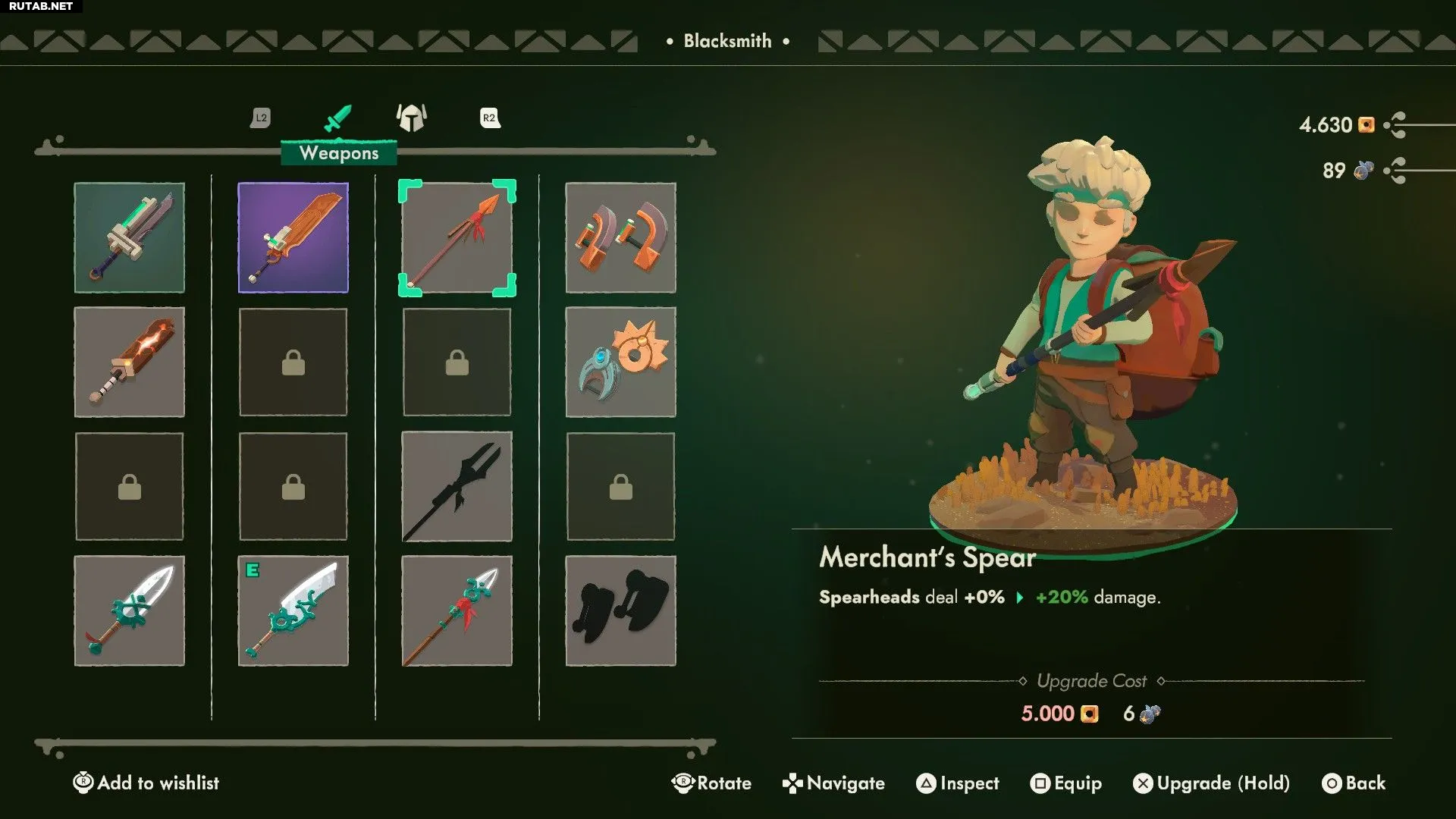 Четыре варианта стартового оружия: Меч торговца, Большой меч торговца, Копьё торговца и Рукавицы торговца. Каждое обладает уникальными способностями, дающими преимущество в бою, и подходит для разных стилей игры.