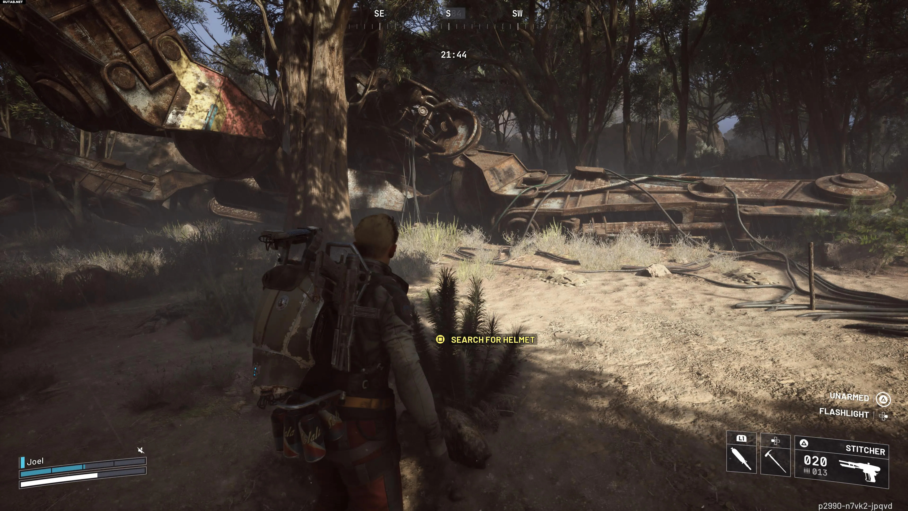 Шлем находится в кусте, показанном на изображении выше, с которым можно взаимодействовать. Он расположен перед обломками робота, рядом с одной из поднятых ног. Взаимодействуйте с кустом, чтобы поднять шлем — он не попадёт в инвентарь, а останется у вас в руках, подобно ящикам на полевых складах.
