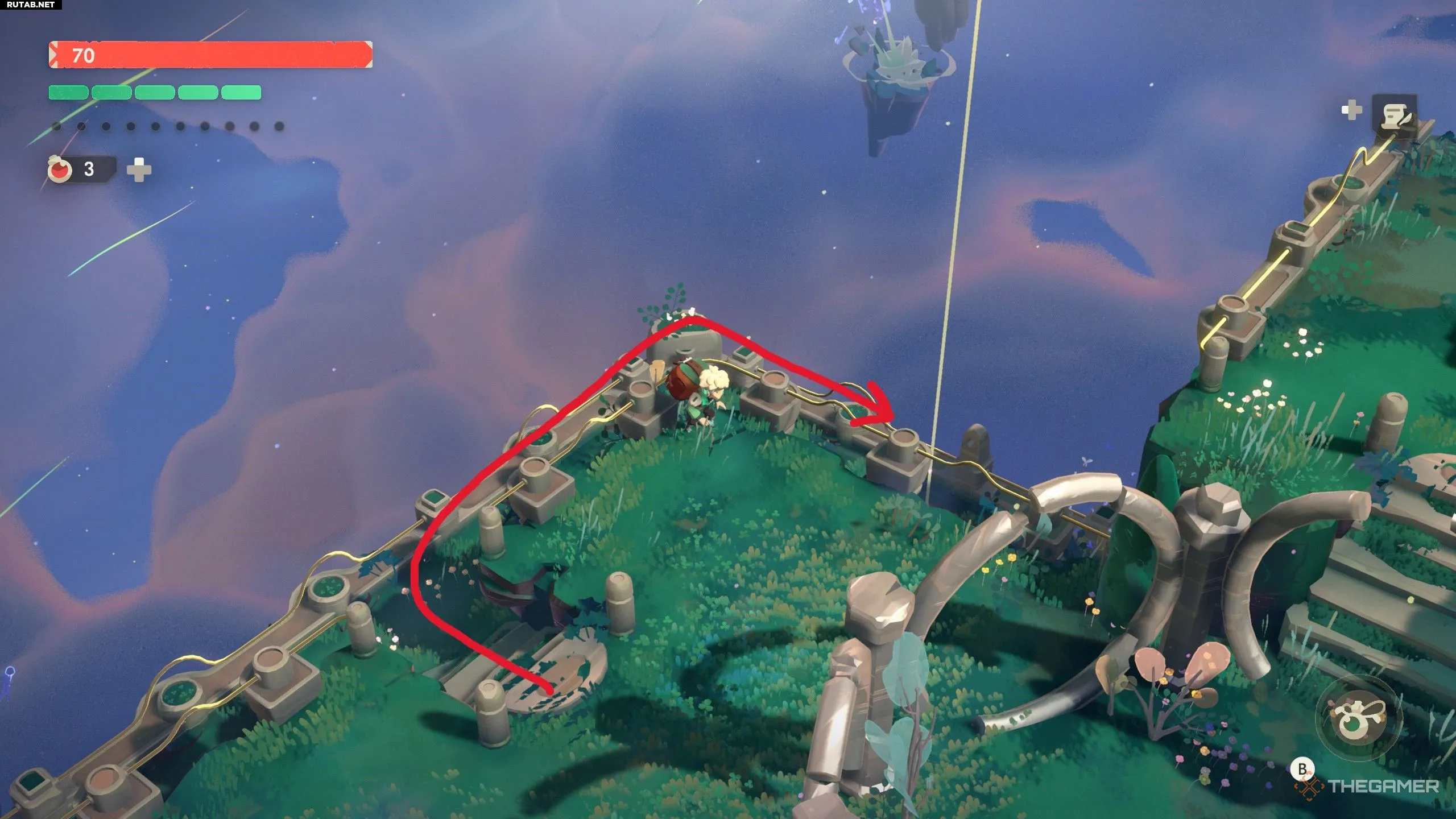 В скрытой зоне двигайтесь по zip-line до трёхстороннего перекрёстка. Отсюда нужно перемещаться между парящими островами. Используя фото выше как ориентир, доступные направления: Вверх, Вниз, Влево и Вправо. Эти обозначения сохраняются при смене позиций через zip-line.