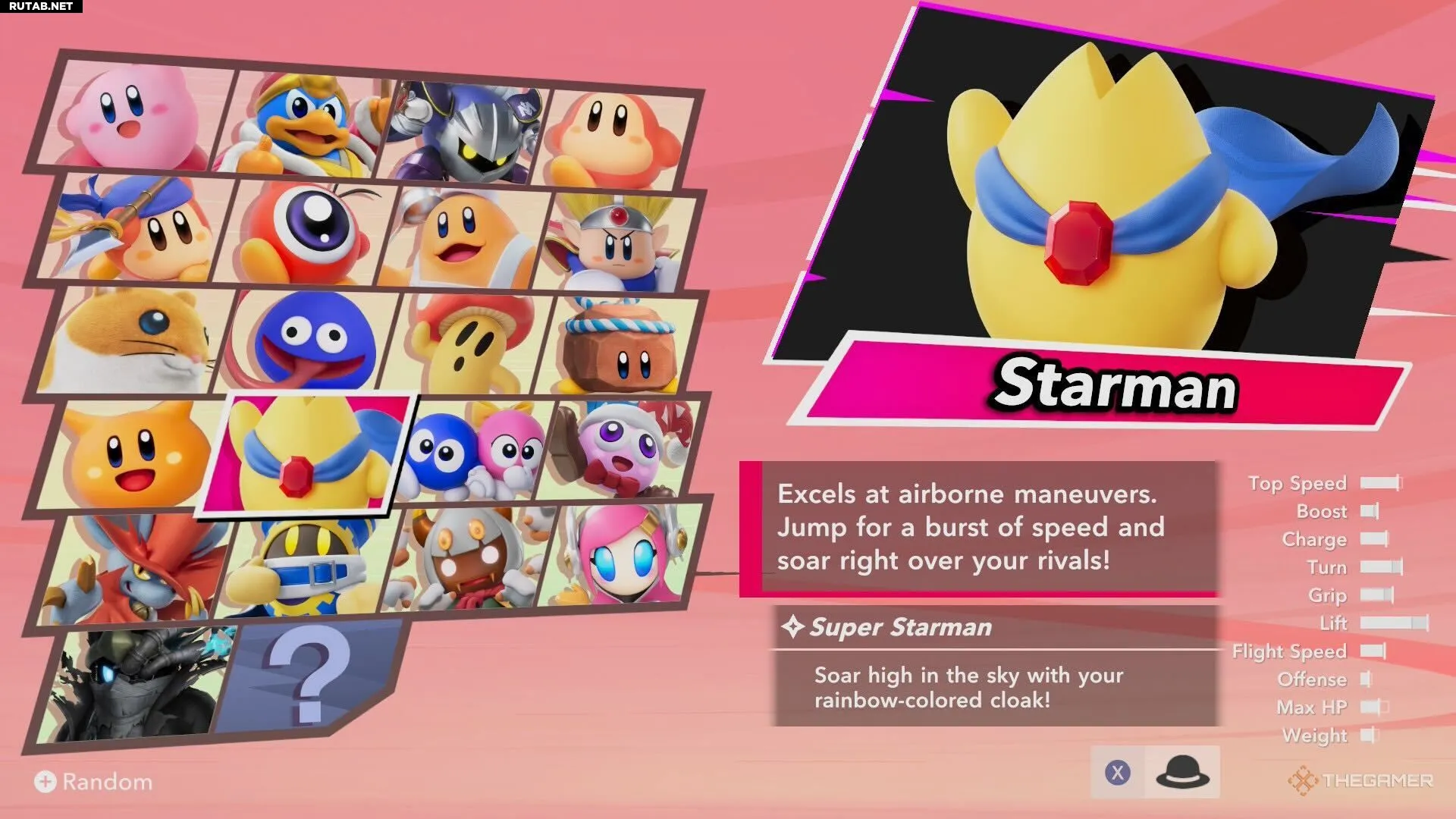 Например, Starman обладает впечатляющим потенциалом планирования, а King Dedede — тяжелее, но с большим запасом здоровья. Учитывайте эти характеристики, так как они хорошо сочетаются с определёнными Машинами. Это особенно важно в режиме City Trial, где нужно искать Машину, оптимально подходящую вашему персонажу и собранным статам.