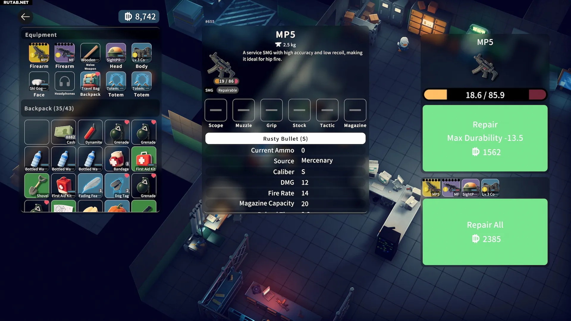 Оружие можно починить после постройки мастерской, но здесь есть нюанс. Ремонт не только требует значительных денег (что становится менее важно по мере накопления капитала), каждый ремонт уменьшает максимальную прочность оружия. Эта потеря прочности показана красной полосой, которую вы могли заметить рядом с синими полосками под вашим оружием. Таким образом, каждый ремонт не только означает, что оружие будет изнашиваться быстрее, но в конечном итоге его станет невозможно починить. Останется только разобрать оружие, что, к счастью, позволит сохранить все установленные на нём обвесы.