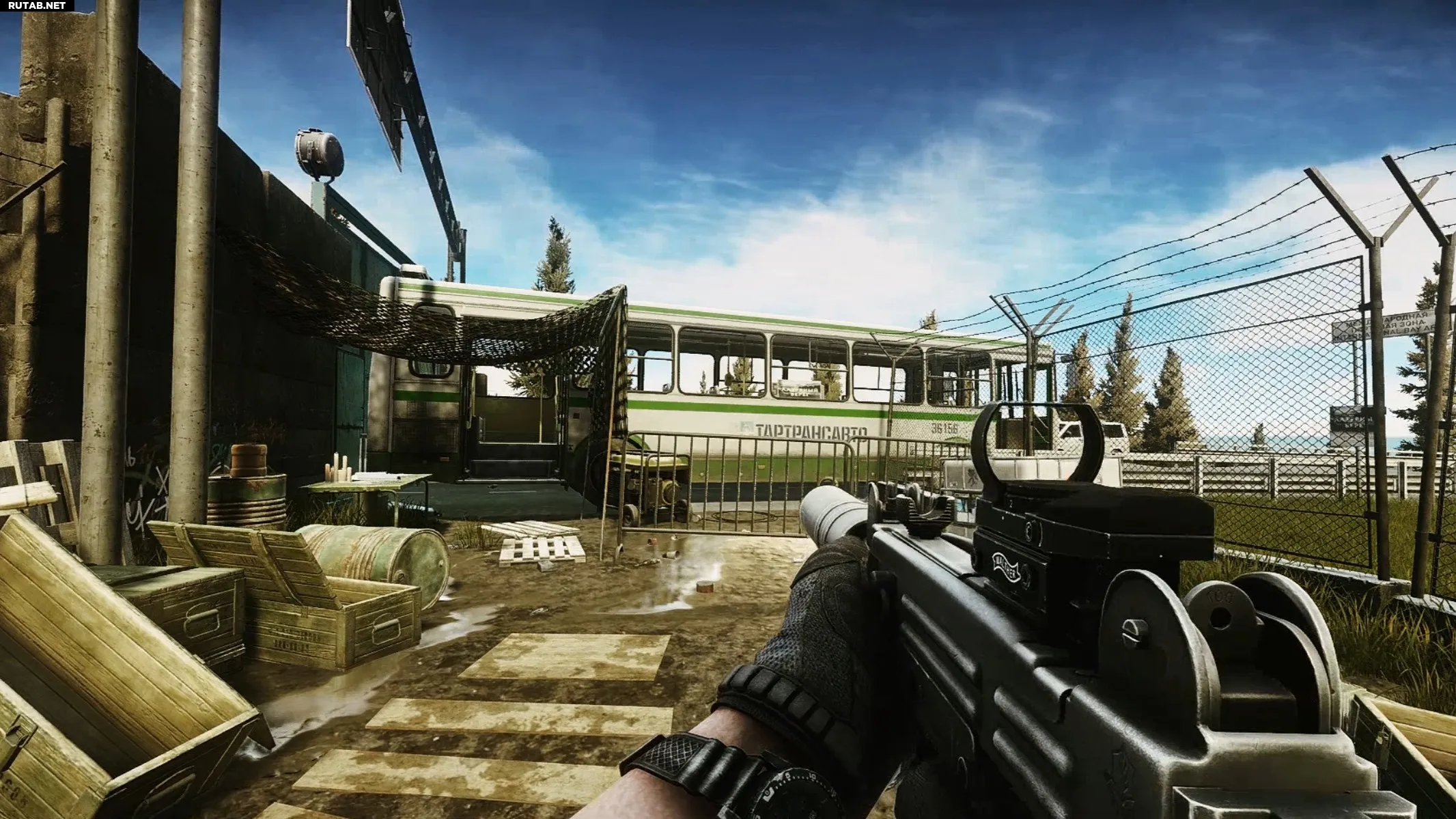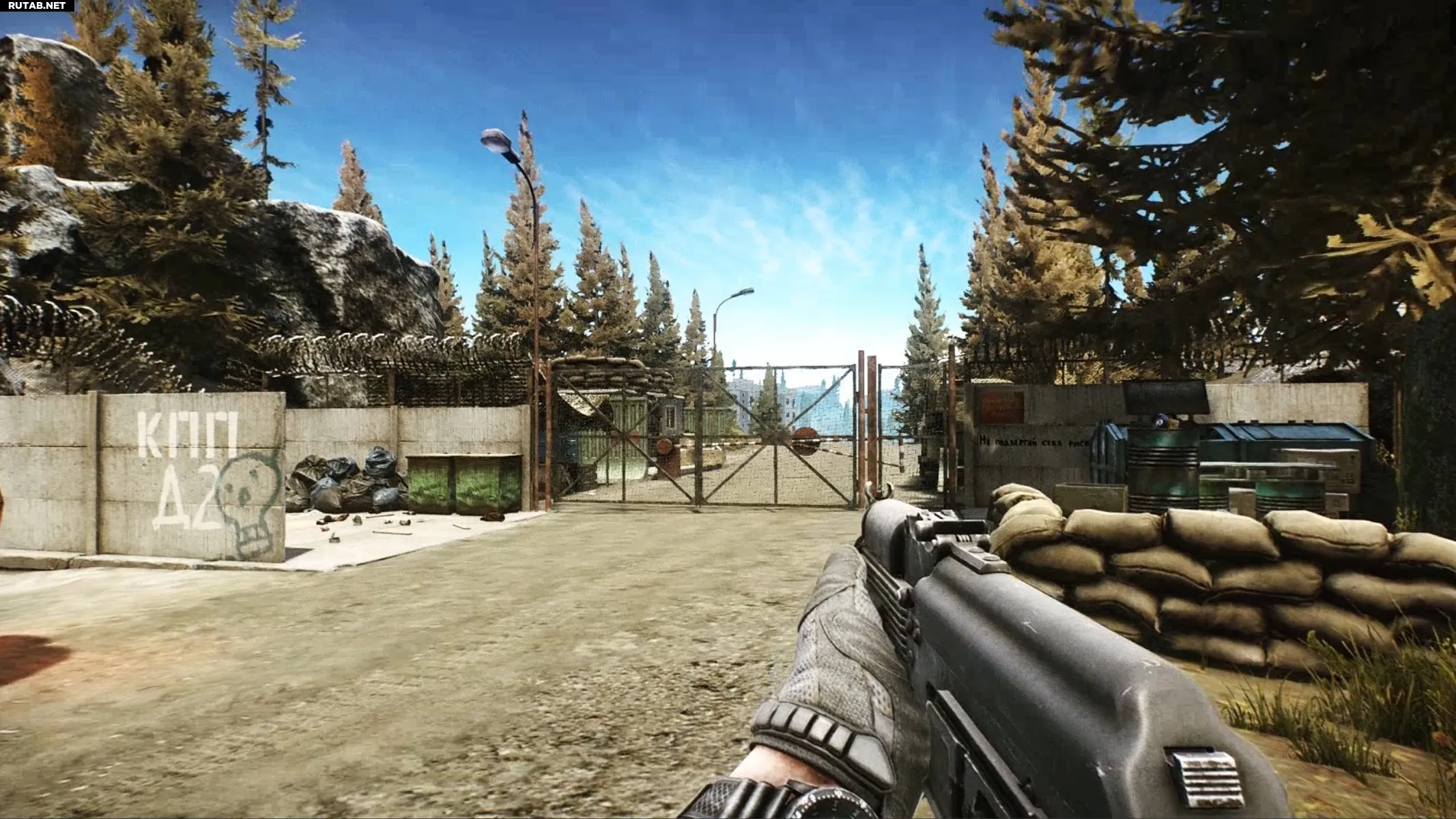 Направляйтесь к точке выхода КПП сталкеров и пройдите по дороге за ворота. Транзитная зона расположена непосредственно у этих ворот, что логично — они ведут в сторону выхода КПП военной базы.