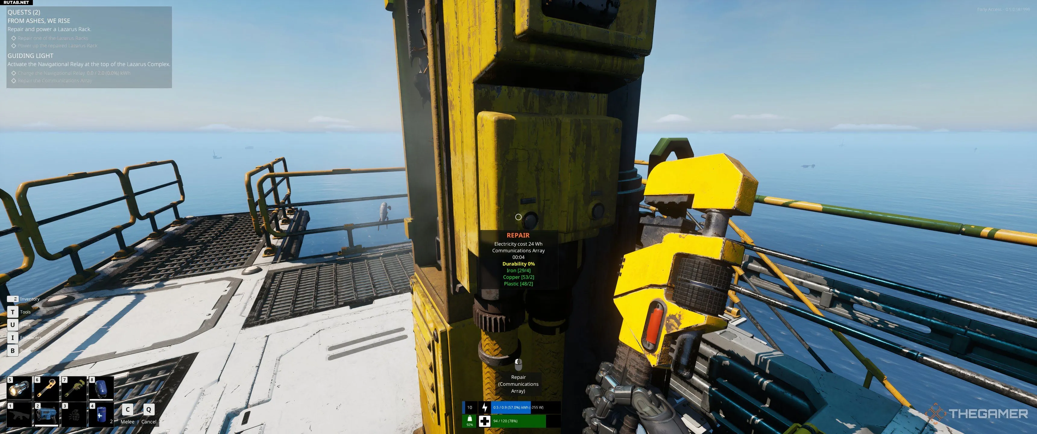 Дождитесь наступления дня и возьмите с собой четыре единицы железа, две меди и два пластика — эти материалы понадобятся для ремонта коммуникационной антенны на вершине башни.