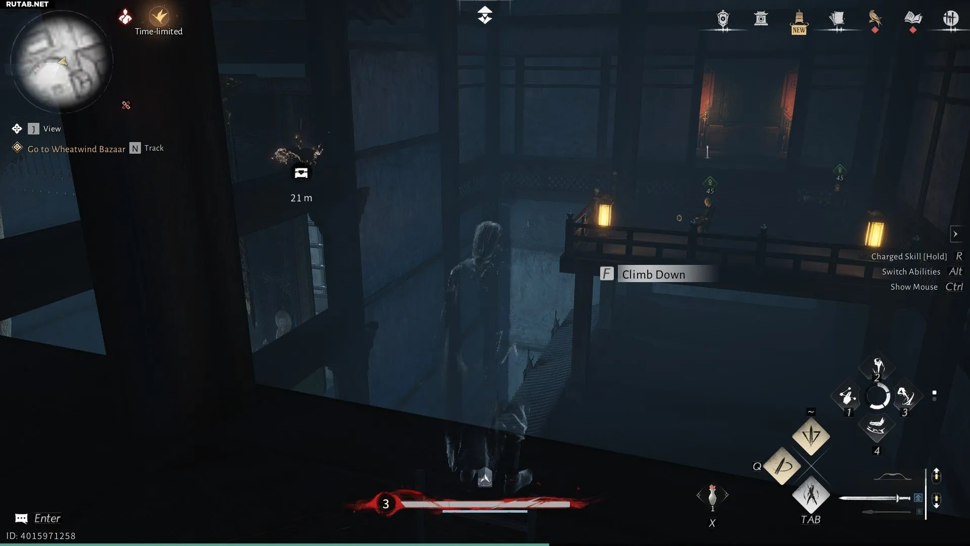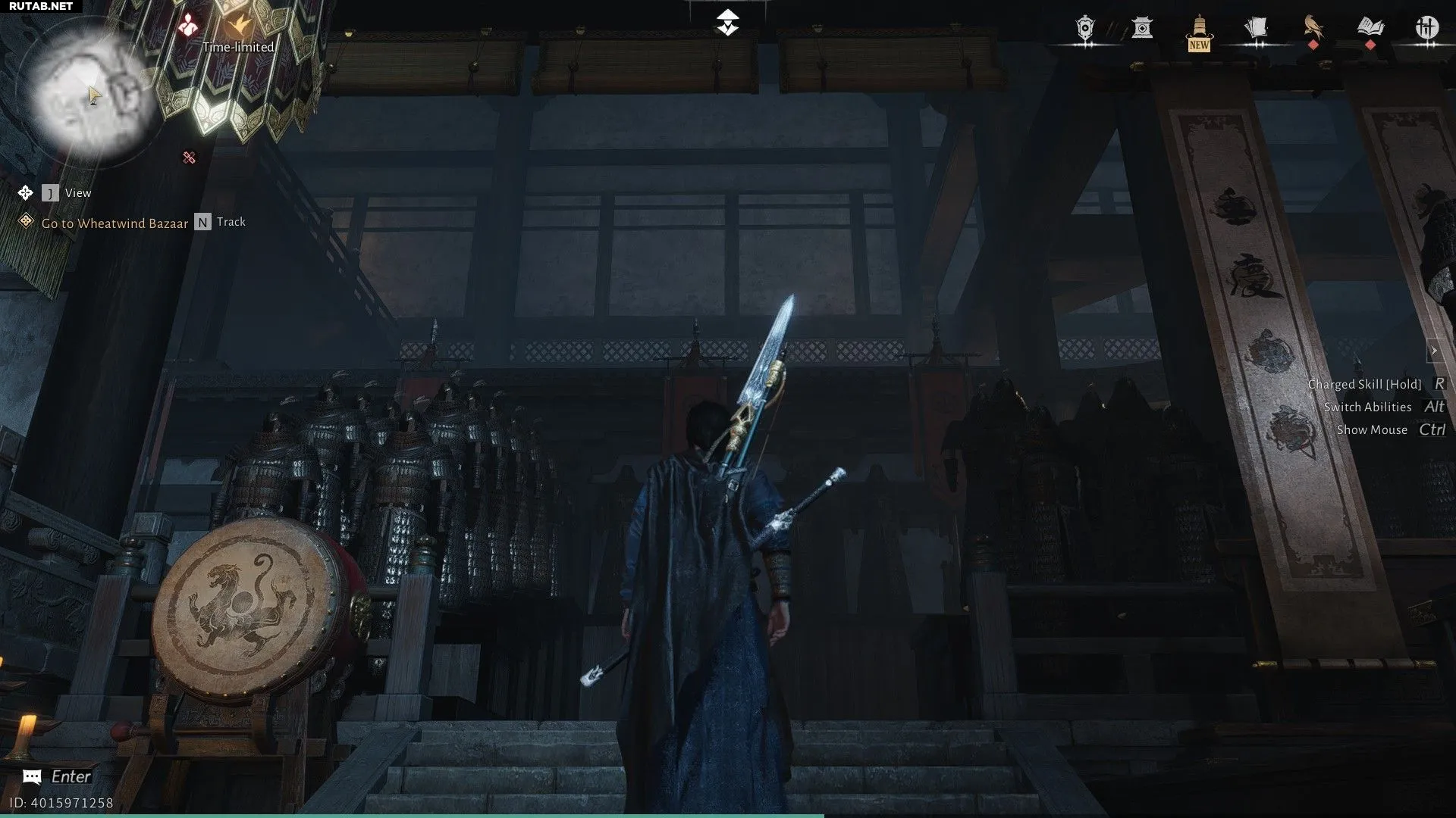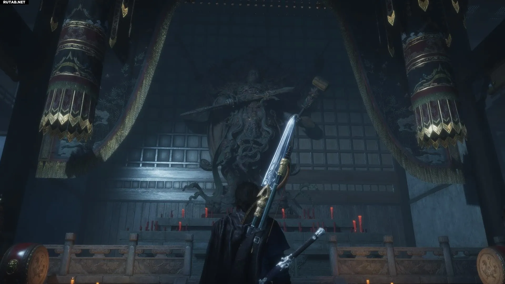 Карабкайтесь по опорным балкам вокруг зала. Начните с подъёма по меньшим статуям, чтобы добраться до лестницы. Устраните врагов на балконах, чтобы не мешали, или используйте умение «Покров Безмолвия», которое можно изучить на Лунном Пике в Цинхэ.