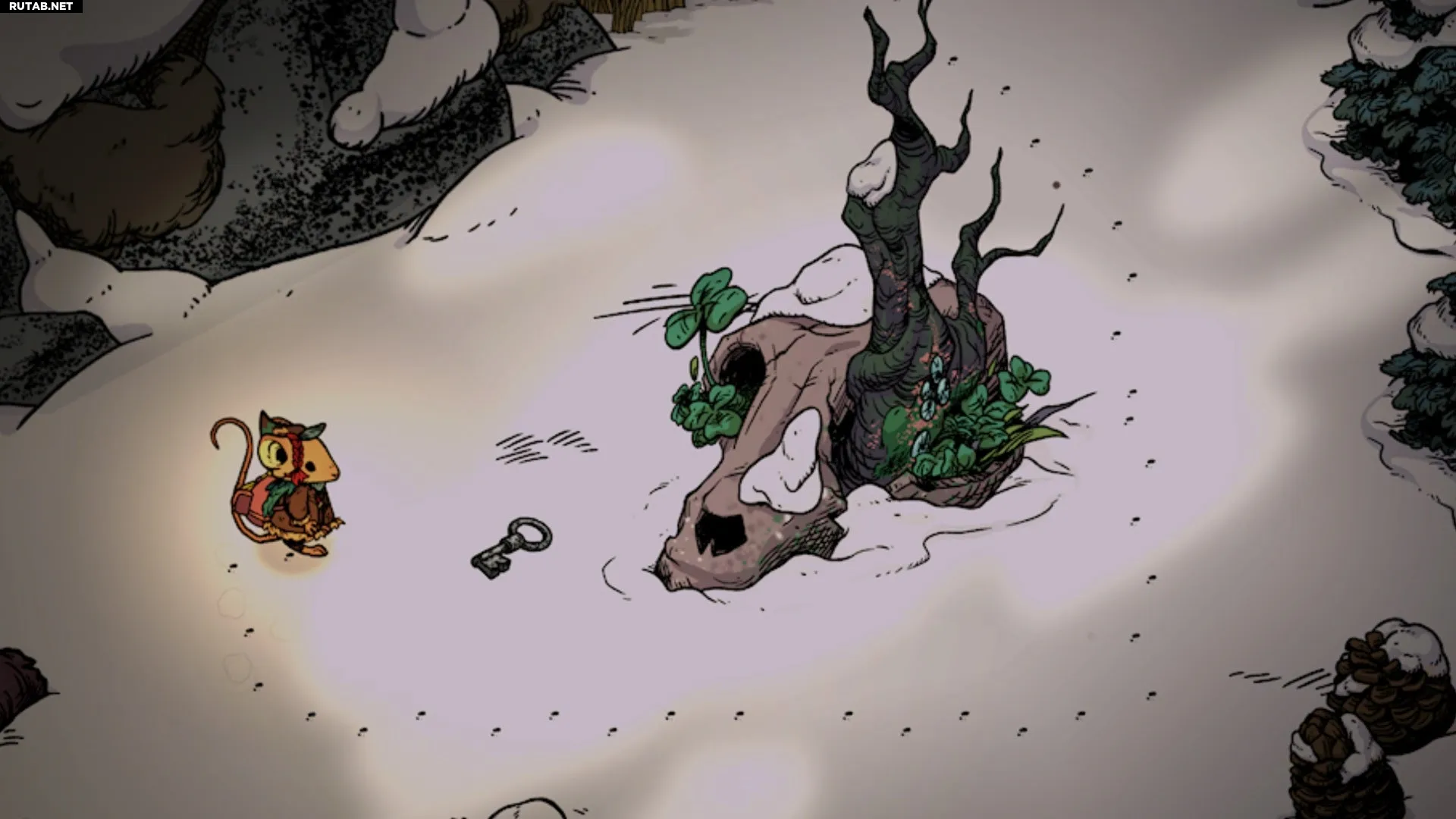 С урчанием в животе, Мох вспоминает, что его напарник Сосновая Шишка унес ключ от их кладовой, когда уходил на задание. Будучи помогающей мышкой в Зимней Норе, вы предлагаете отправиться на поиски ключа, чтобы Мох не остался голодным.