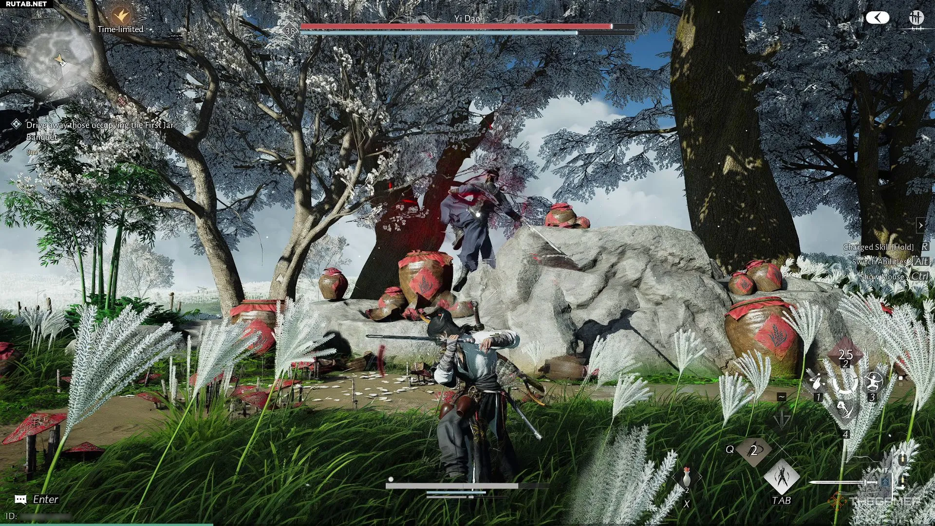 И Дао сочетает прыгающие атаки мечом с волнами энергетических клинков, так что безопасной дистанции против него не существует. Его самая частая атака — прыжок с рубящим ударом сверху. Это красная атака, а значит, если вы парируете её, то выполните контратаку, нанеся огромный урон по ци.
