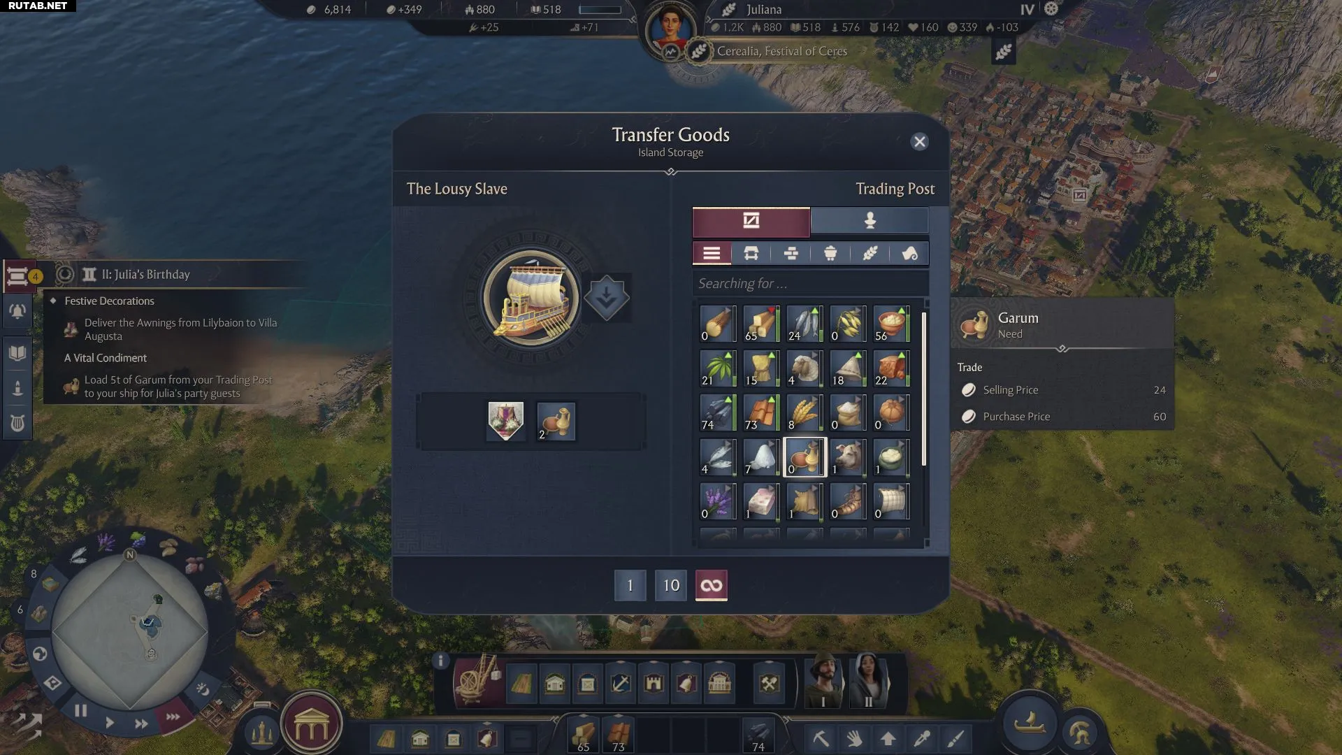 Погрузите гарнум на корабль и вернитесь к Юлии. После этого Луций попросит доставить плитку. Подготовьте и передайте необходимые материалы.