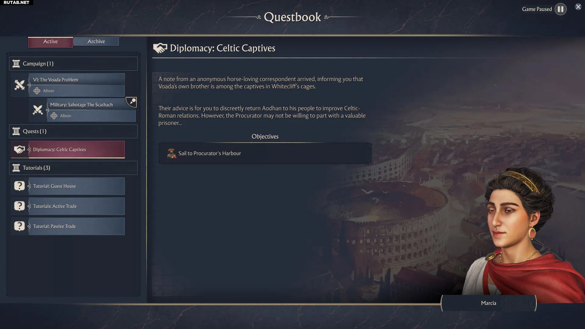 Квест «Кельтские пленники» становится доступен после выполнения двух предыдущих миссий. Отправьтесь к прокуратору и поговорите с ним о пленнике.