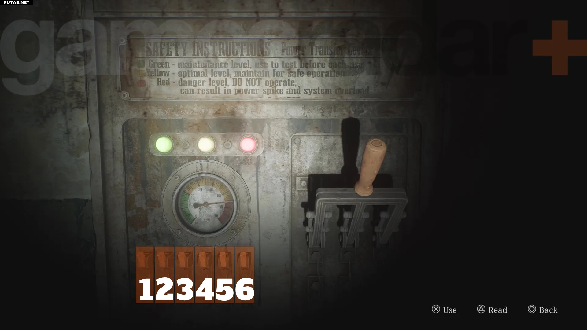 Головоломка решается с помощью панели управления рядом с дверью, соединяющей Комнату смерти и Комнату свидетелей. На панели шесть тумблеров и главный рычаг. Цель — включить их в правильной последовательности, чтобы мощность достигла красной зоны. Вот верная последовательность действий:
