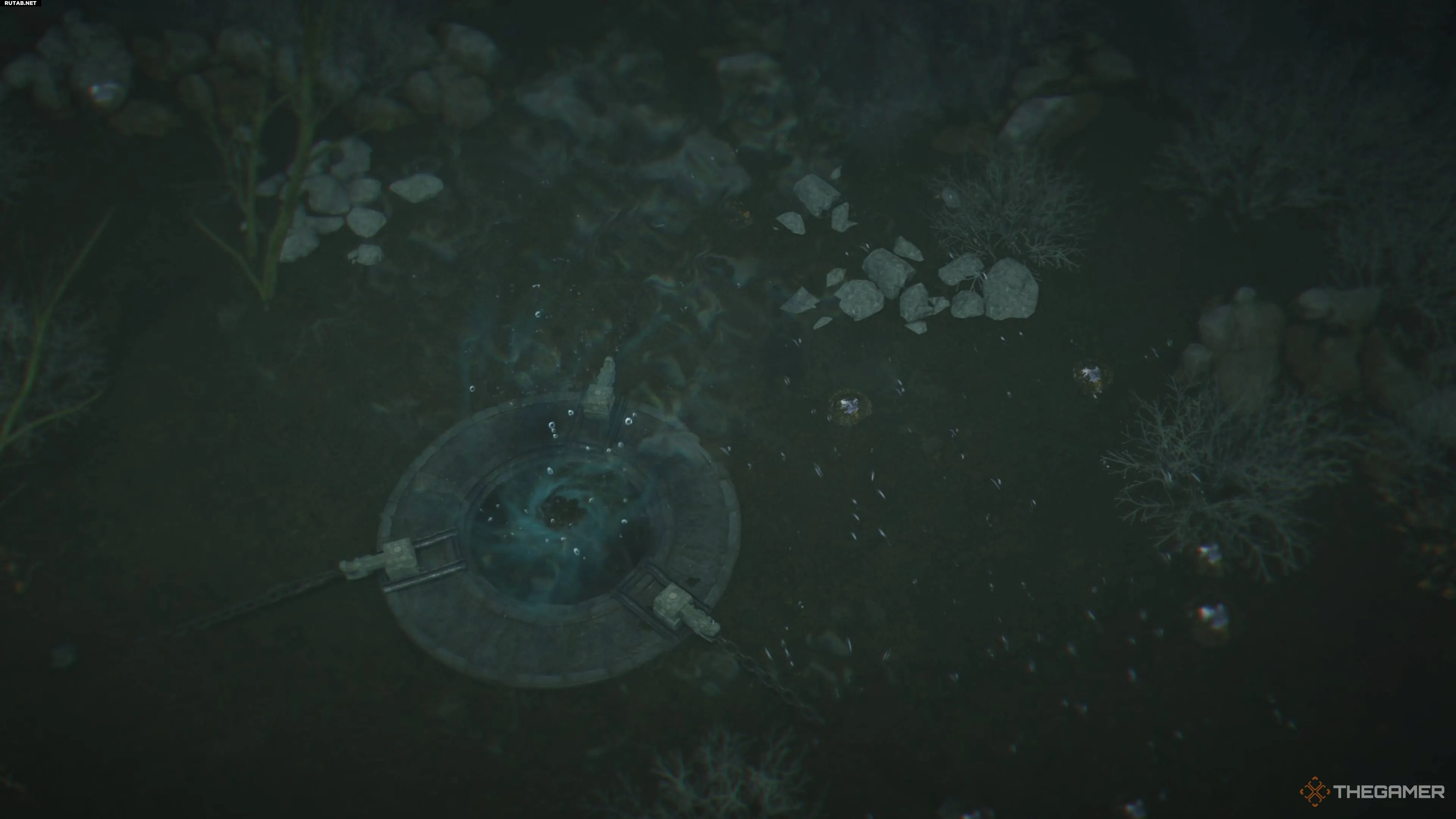 Нырните в озеро и начните поиски. В центре вы обнаружите огромный слив с тремя цепями. Вам нужно проследовать по этим цепям, найти, к чему они прикреплены, и активировать механизм, чтобы освободить их.