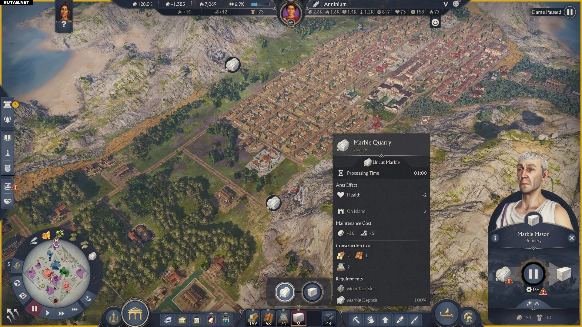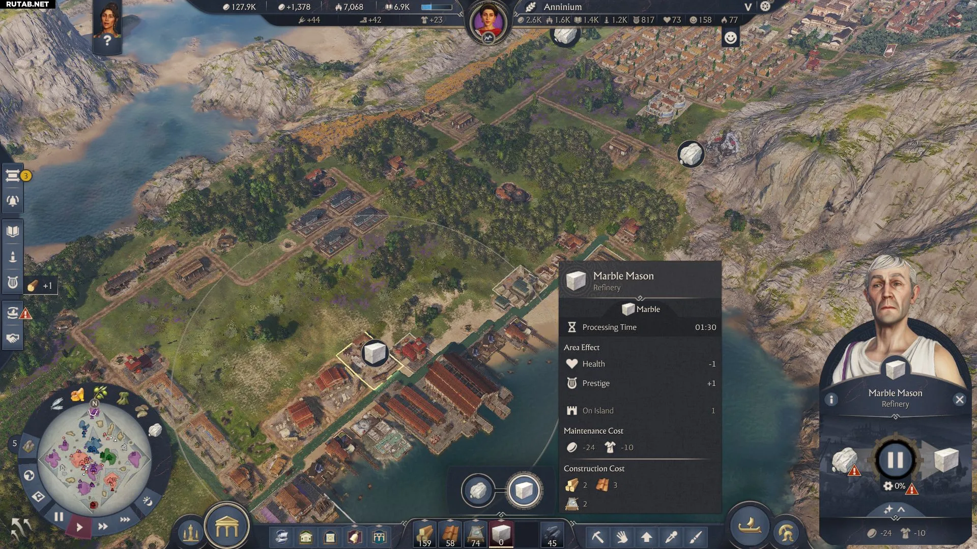 Затем постройте Мраморную мастерскую для обработки необработанного мрамора. Как и с бетоном, карьер требует рабочих-плебеев, а мастерская должна управляться эквитами.