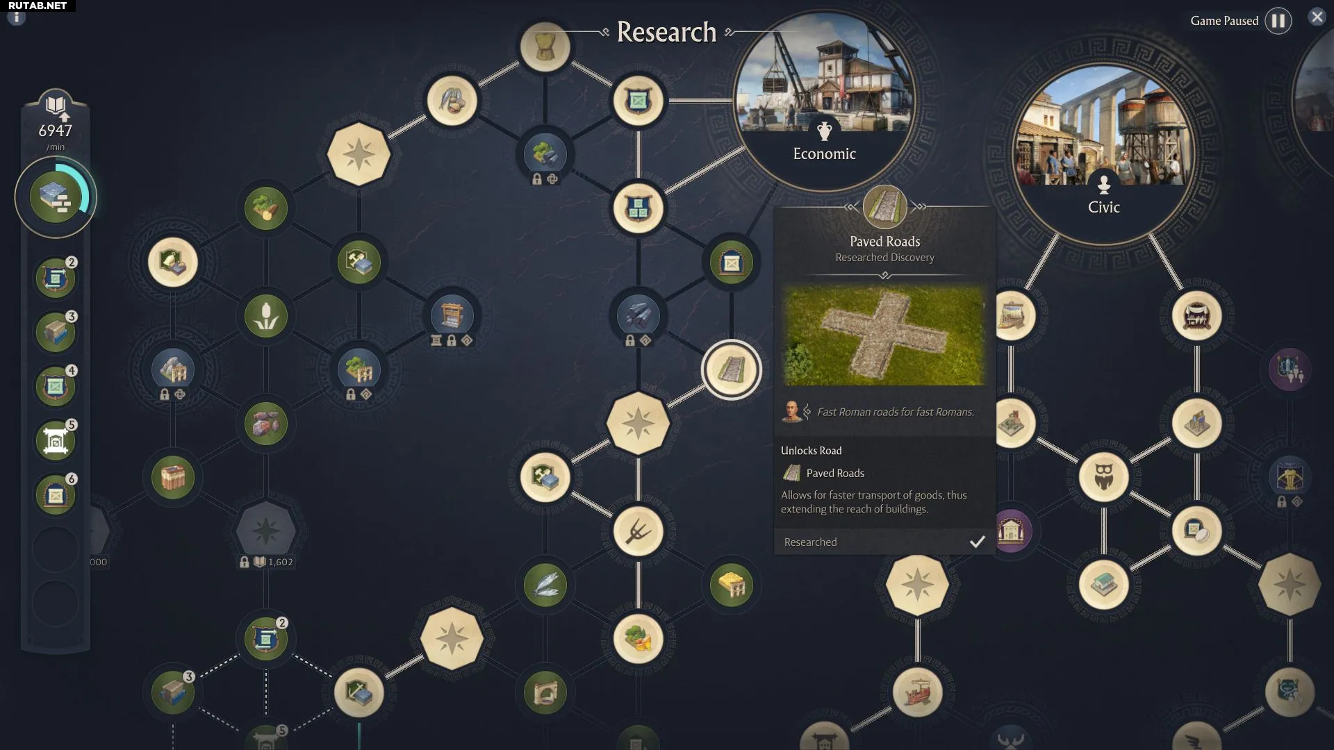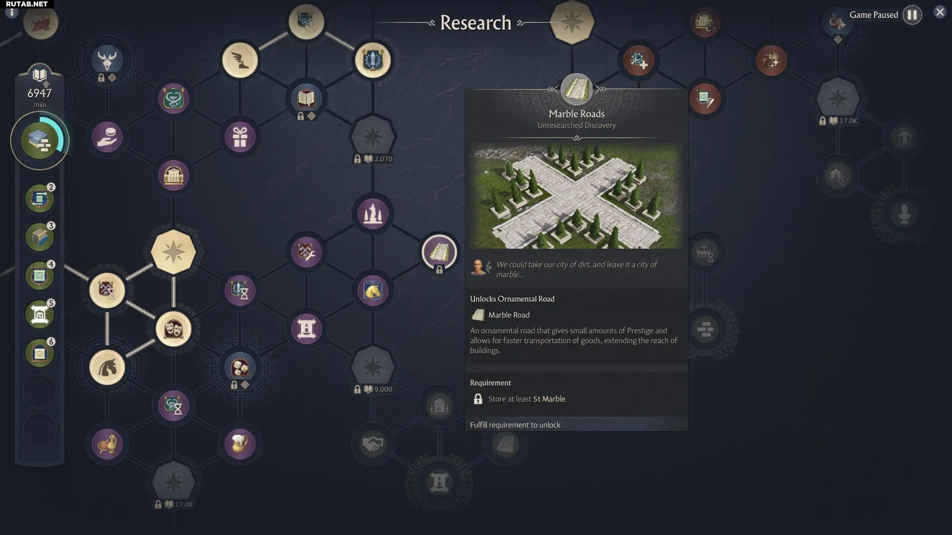 Следующее улучшение — Мраморные дороги. Для их разблокировки необходимо иметь на складе не менее 5 единиц мрамора. Как и Мощеные дороги, они ускоряют транспортировку и расширяют охват зданий, но также дают небольшое количество престижа. Это исследование доступно в гражданской ветке.