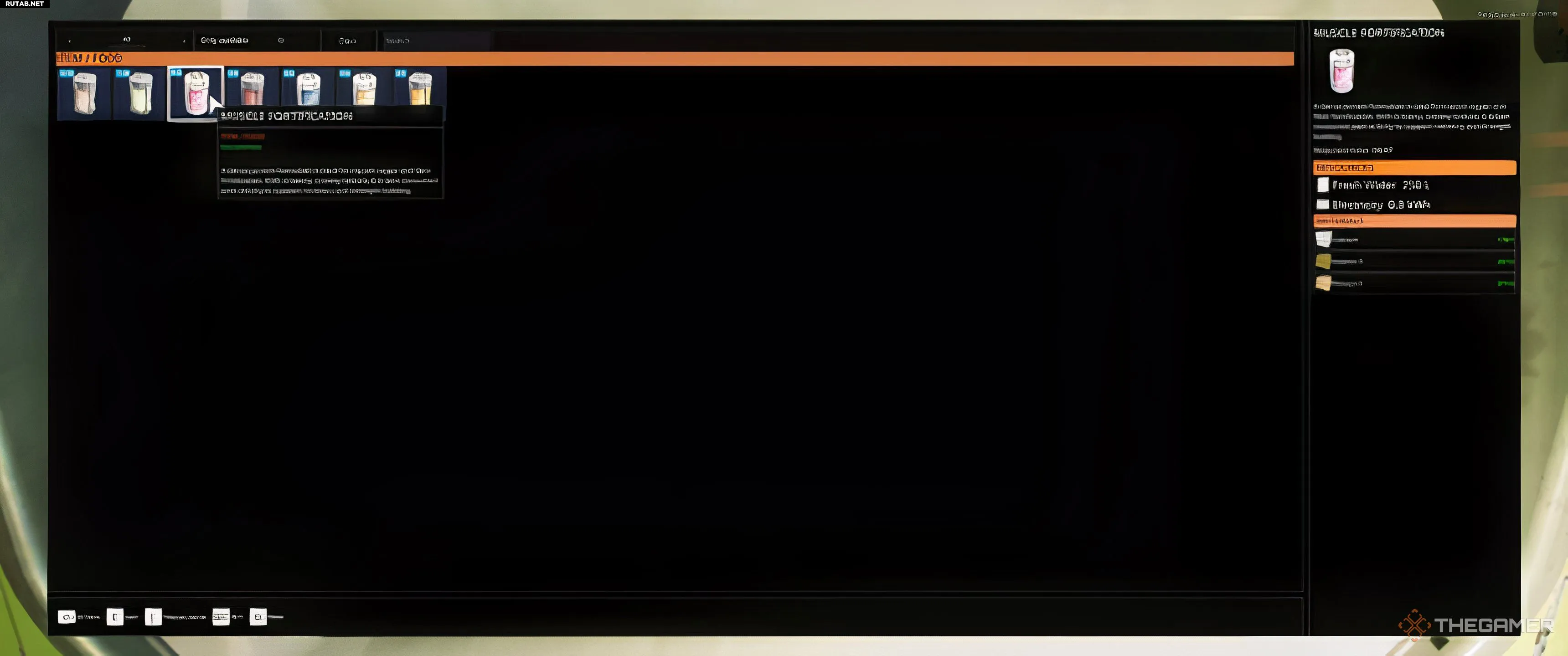 Интерфейс откроется после того, как вы нажмёте E для взаимодействия. Здесь вы увидите доступные предметы, а также текущие характеристики вашего человека. Сначала рассмотрим физические характеристики в связи с предметами, усиливающими рост.