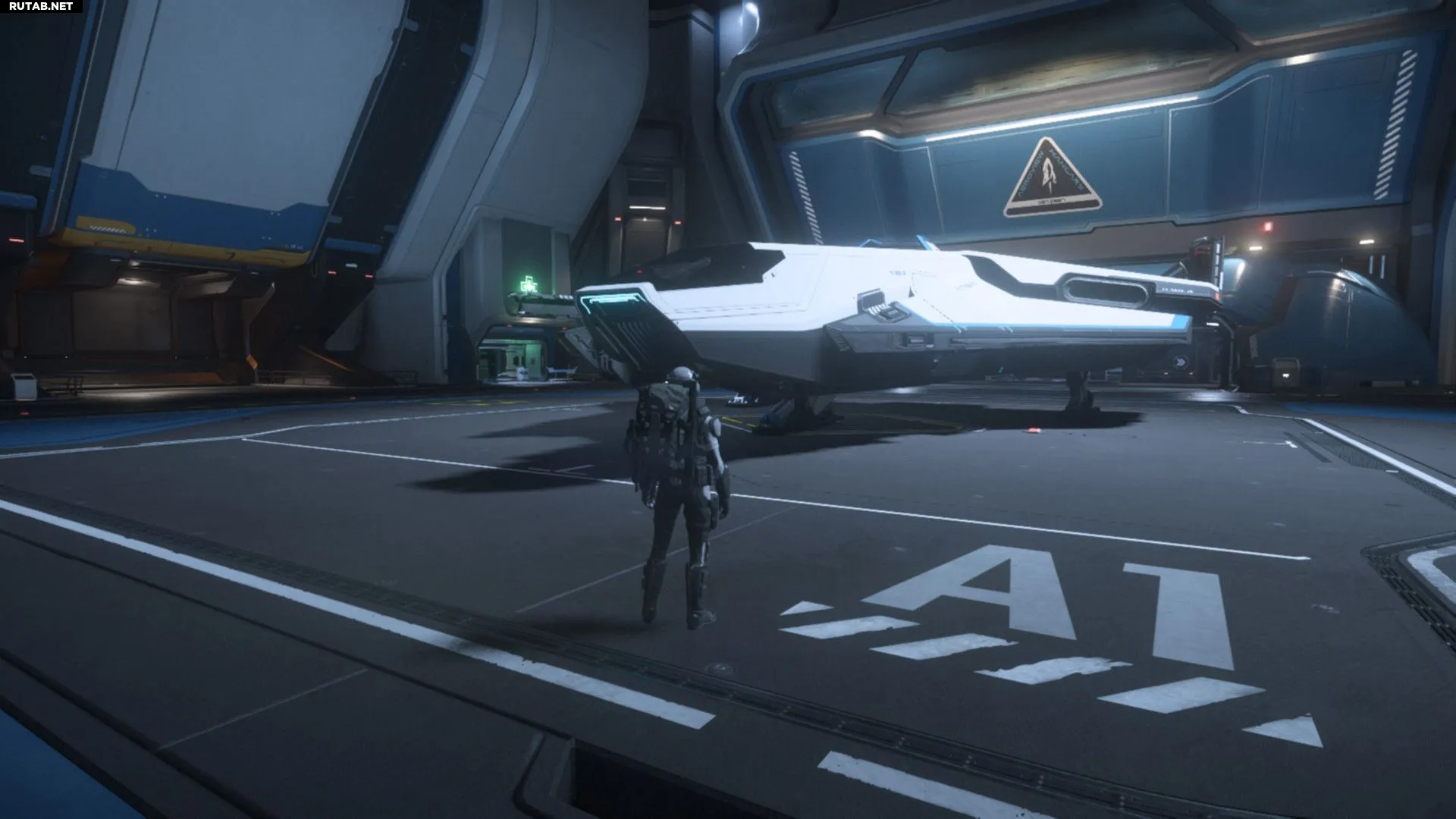 Сначала нужно «запросить» корабль, если вы еще этого не сделали. Для этого отправляйтесь в космопорт Нового Бэббиджа (NBIS) и найдите терминал «Управления флотом» — они расположены перед лифтами, ведущими в ангары. Дополнительный терминал есть внутри самого ангара.