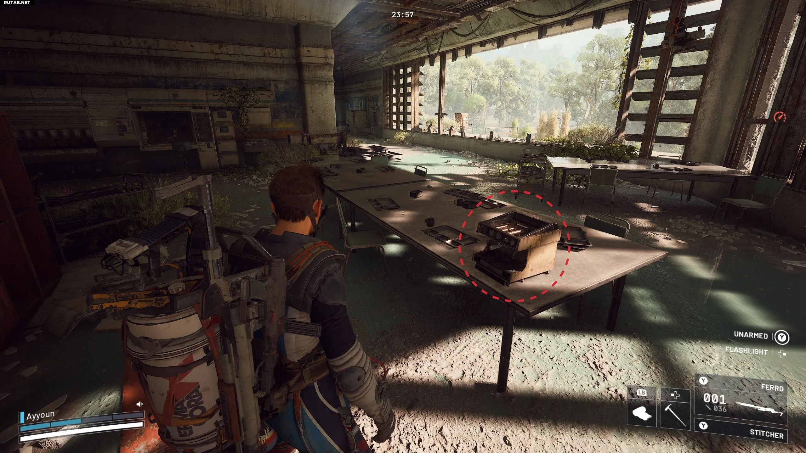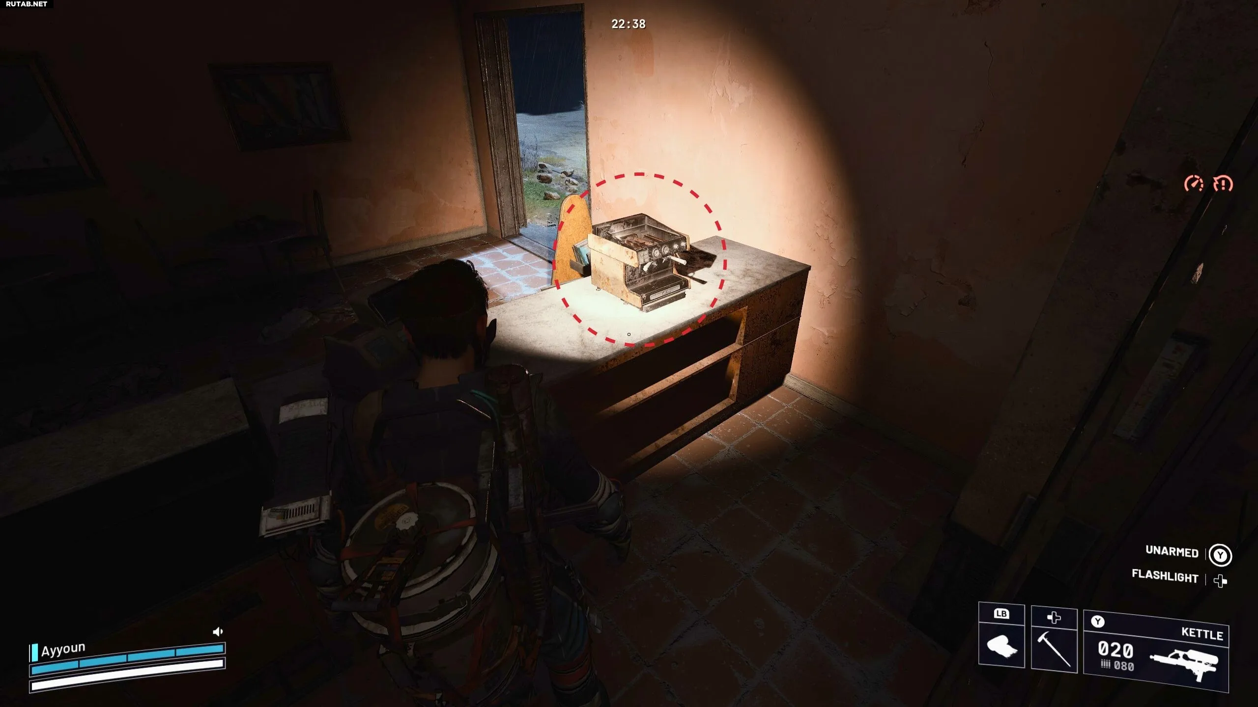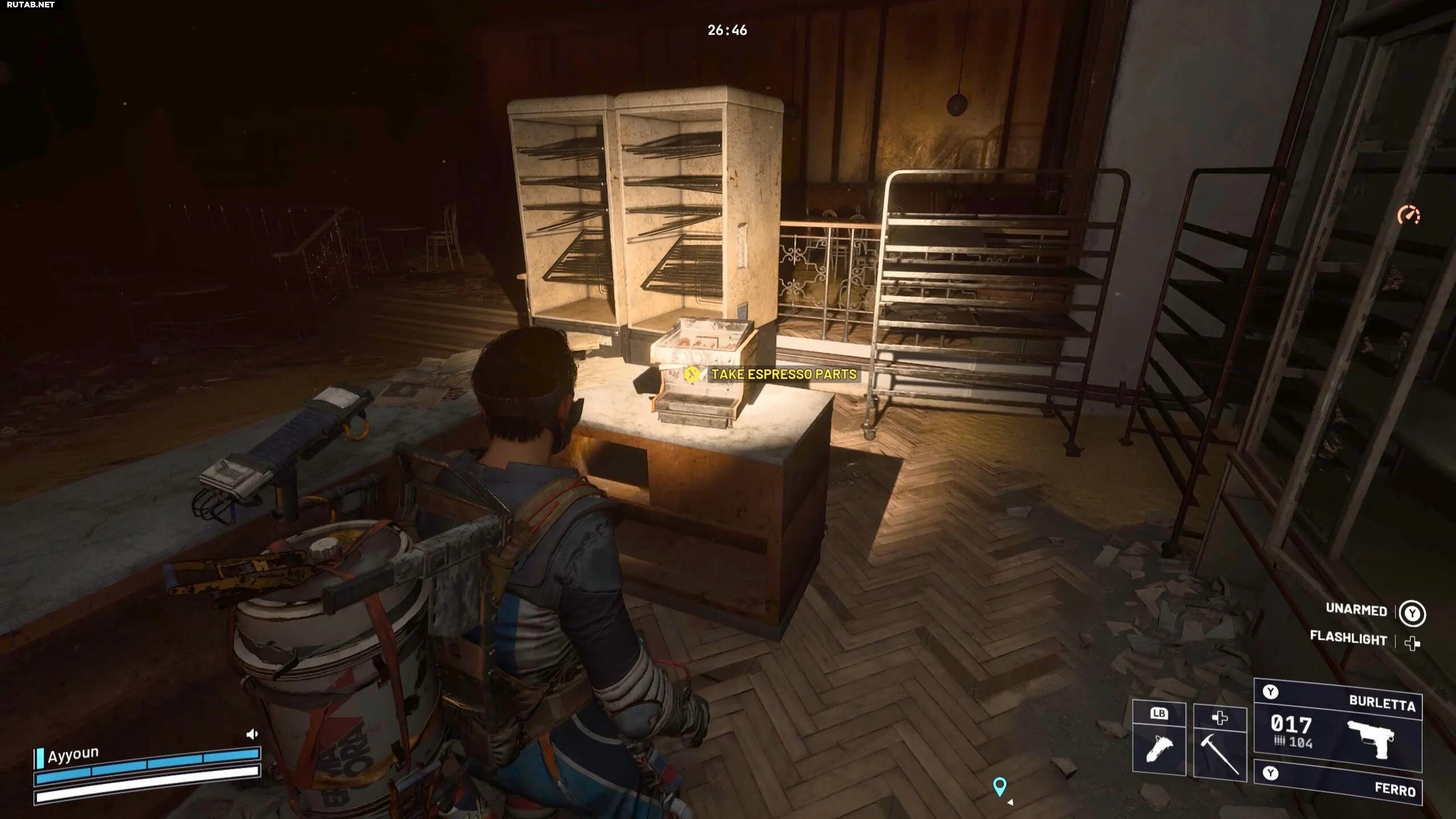 После устранения турели поверните направо и осмотрите стойку — там вы найдете ржавую эспрессо-машину. Взаимодействуйте с ней, чтобы получить части эспрессо-машины. Рекомендуется положить предмет в «Безопасный карман», чтобы не потерять его до выхода с локации.