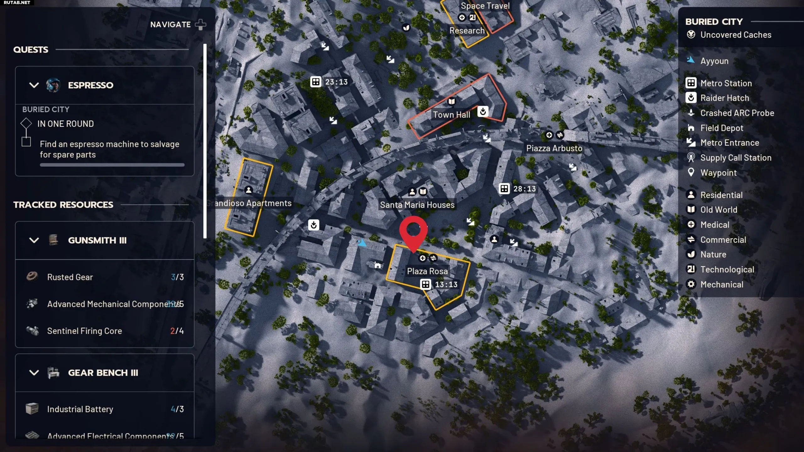 Одно из первых мест для поиска — Plaza Rosa на карте Захороненного города. Локация находится к югу от Ратуши и считается зоной со средним уровнем лута, поэтому будьте готовы встретить других рейдеров.