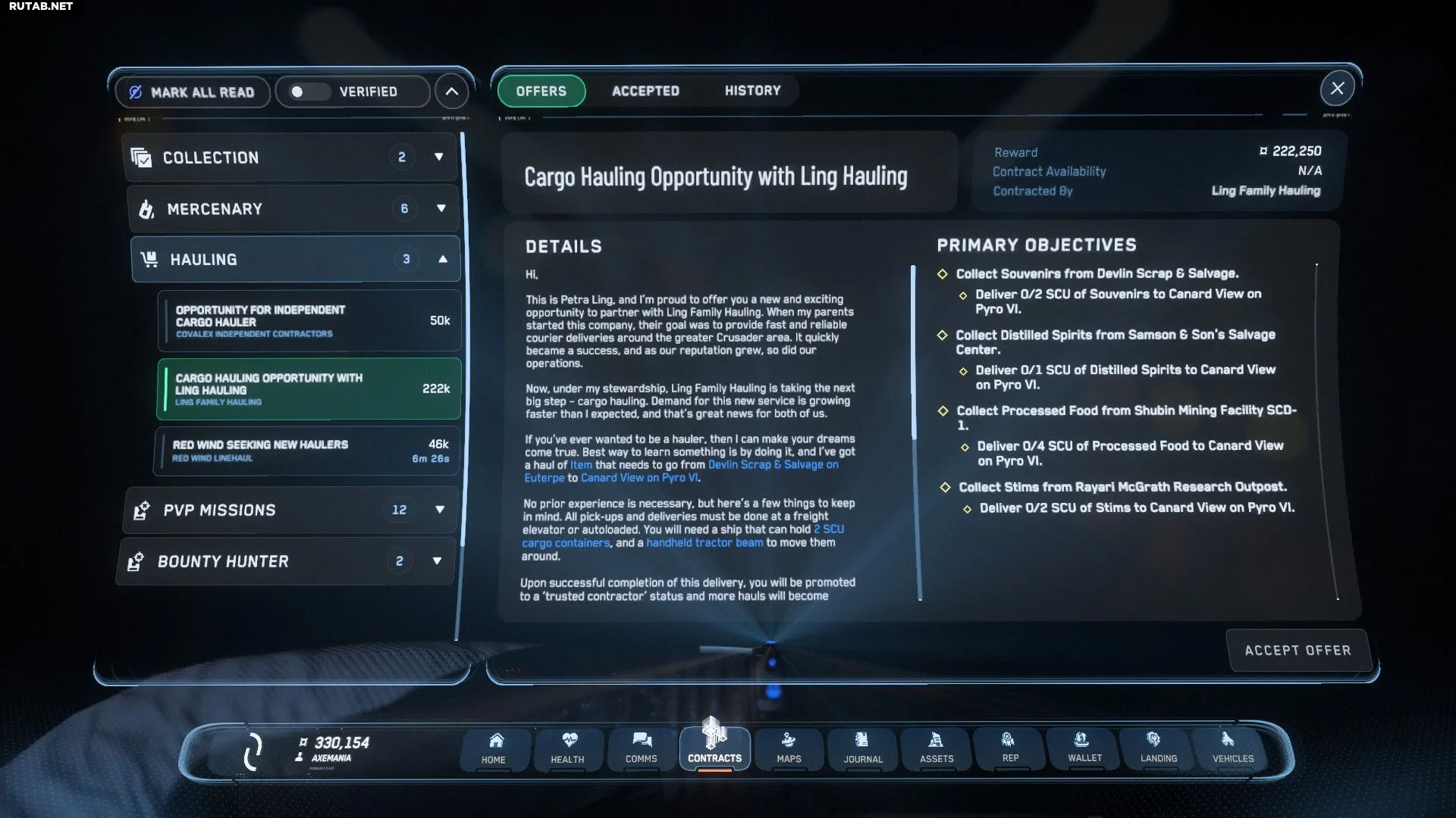 Если вы не брезгуете сомнительными заработками, откройте меню «Контракты» в mobiGlas и переключите кнопку «Проверенные» на «Непроверенные». Так вы увидите задания от «Охотников за головами» и Вона. Миссии последнего очень просты и быстро выполняются, но потребуют хорошего боевого корабля вроде «Андромеды» или «Торуса». Если у вас нет подходящего судна, его можно арендовать.
