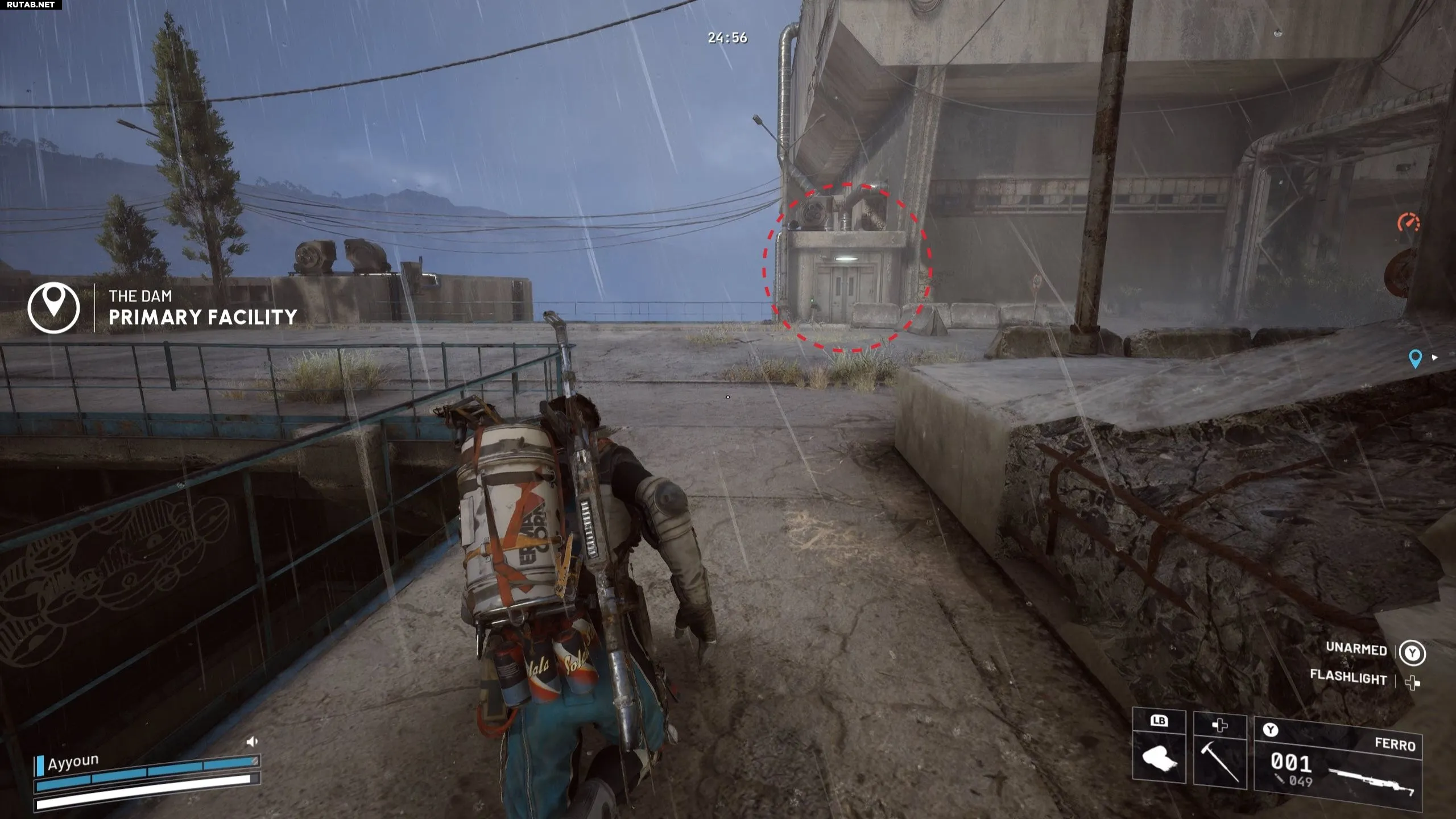 Добравшись до отмеченной на карте точки, вы окажетесь наверху водосбросов. Чтобы начать спуск, войдите в дверь, указанную на изображении.