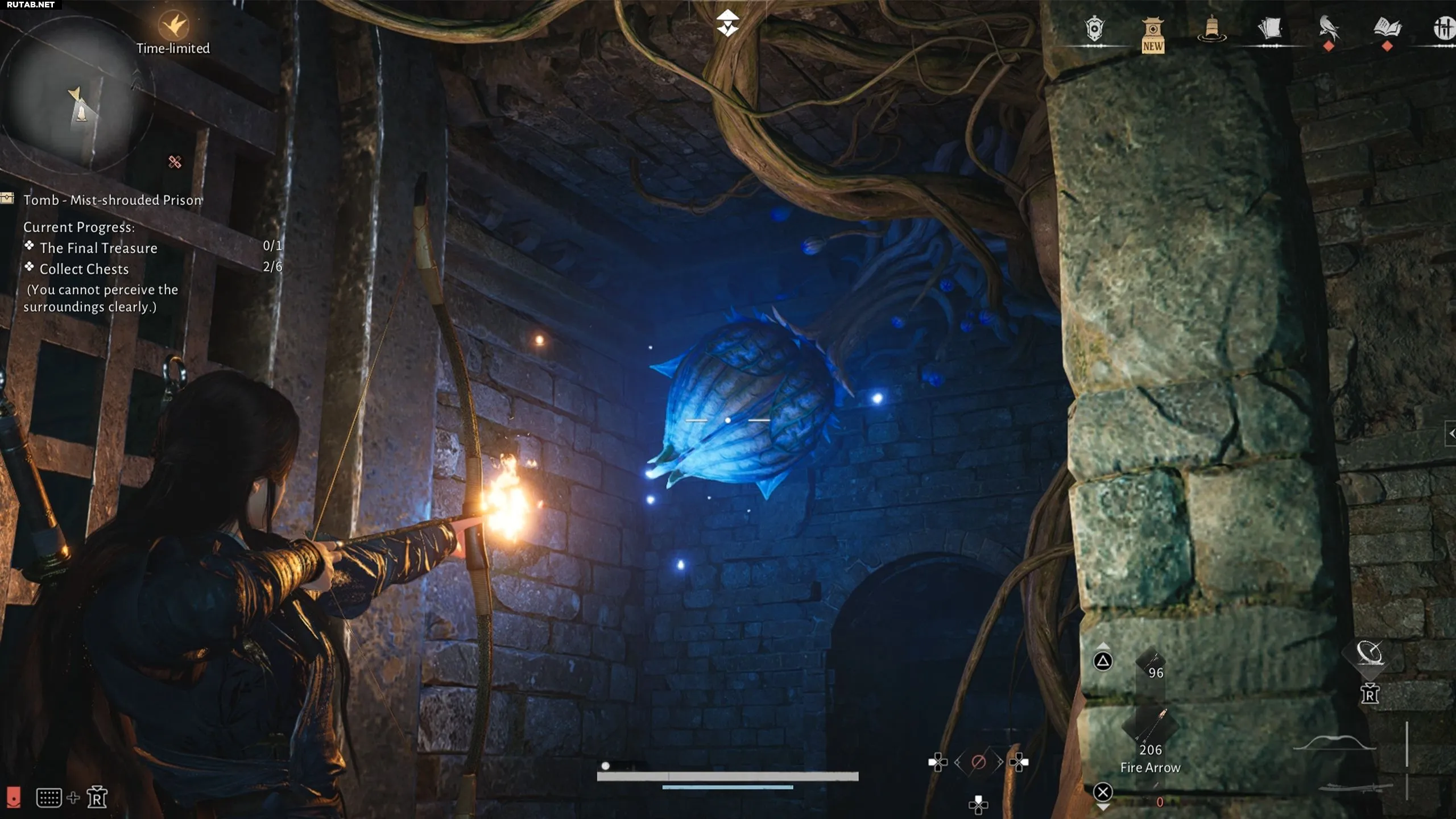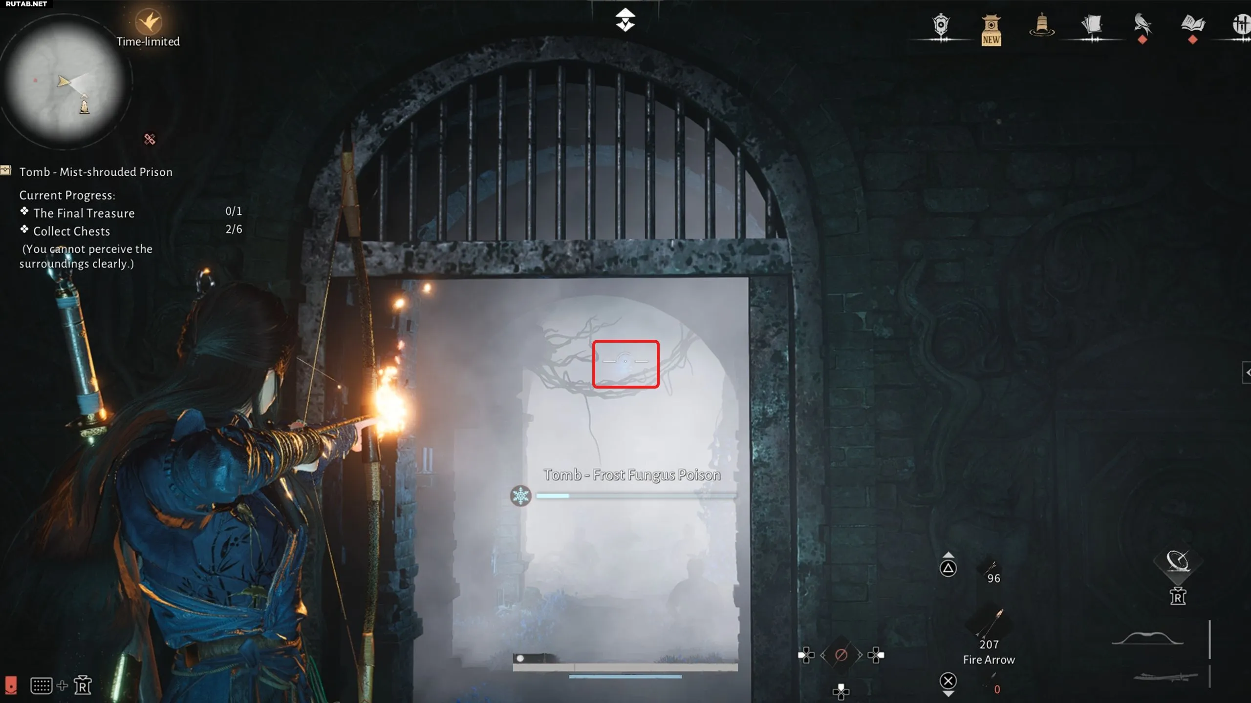 Затем направляйтесь ко входу в Тюрьму, окутанную туманом, расположенному в центральной части Туманного леса. Войдите внутрь и спуститесь на лифте. Чтобы попасть в гробницу, уничтожьте синий бутон огненной стрелой. Важно помнить, что эта гробница постоянно заставляет игроков попадать в временные петли.