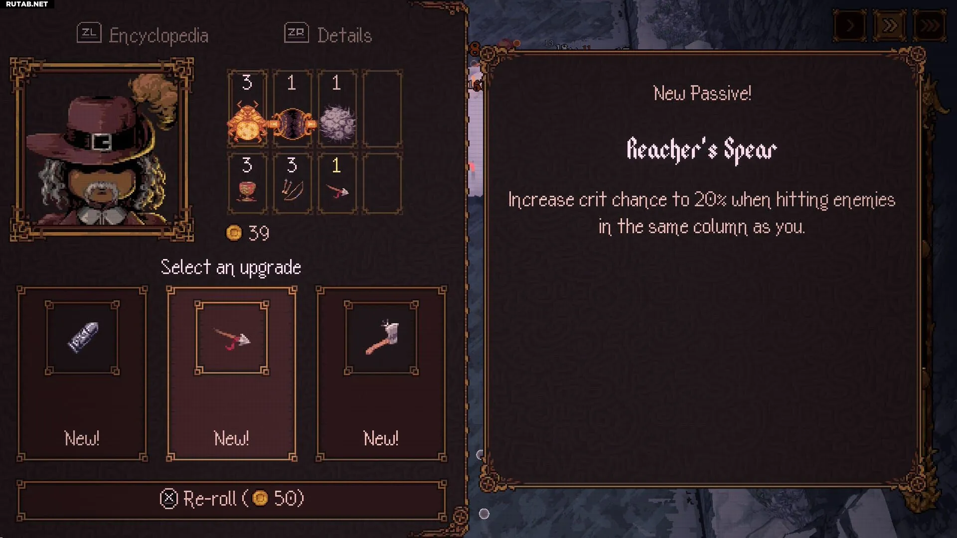 | Reacher's Spear | Increase crit chance to 20 percent when hitting enemies in the same column as you. | Starting passive. |