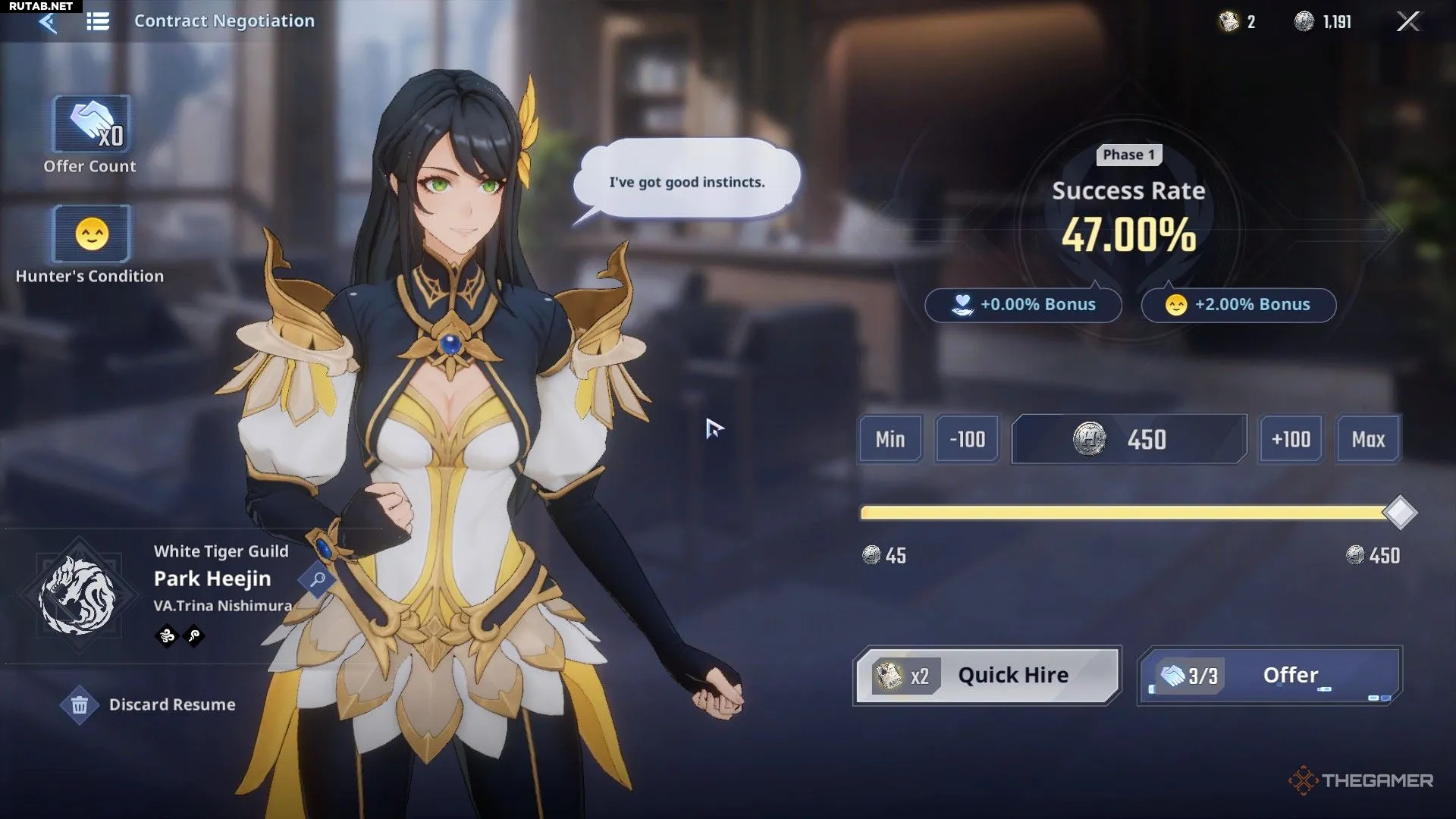 Для начала поговорите с Лим Хадим на нижнем этаже, и она покажет вам список из трёх потенциальных Охотников, которых можно нанять сразу же. Похоже, что эти Охотники выбираются случайным образом из оставшихся 17 персонажей Solo Leveling: Arise Overdrive.