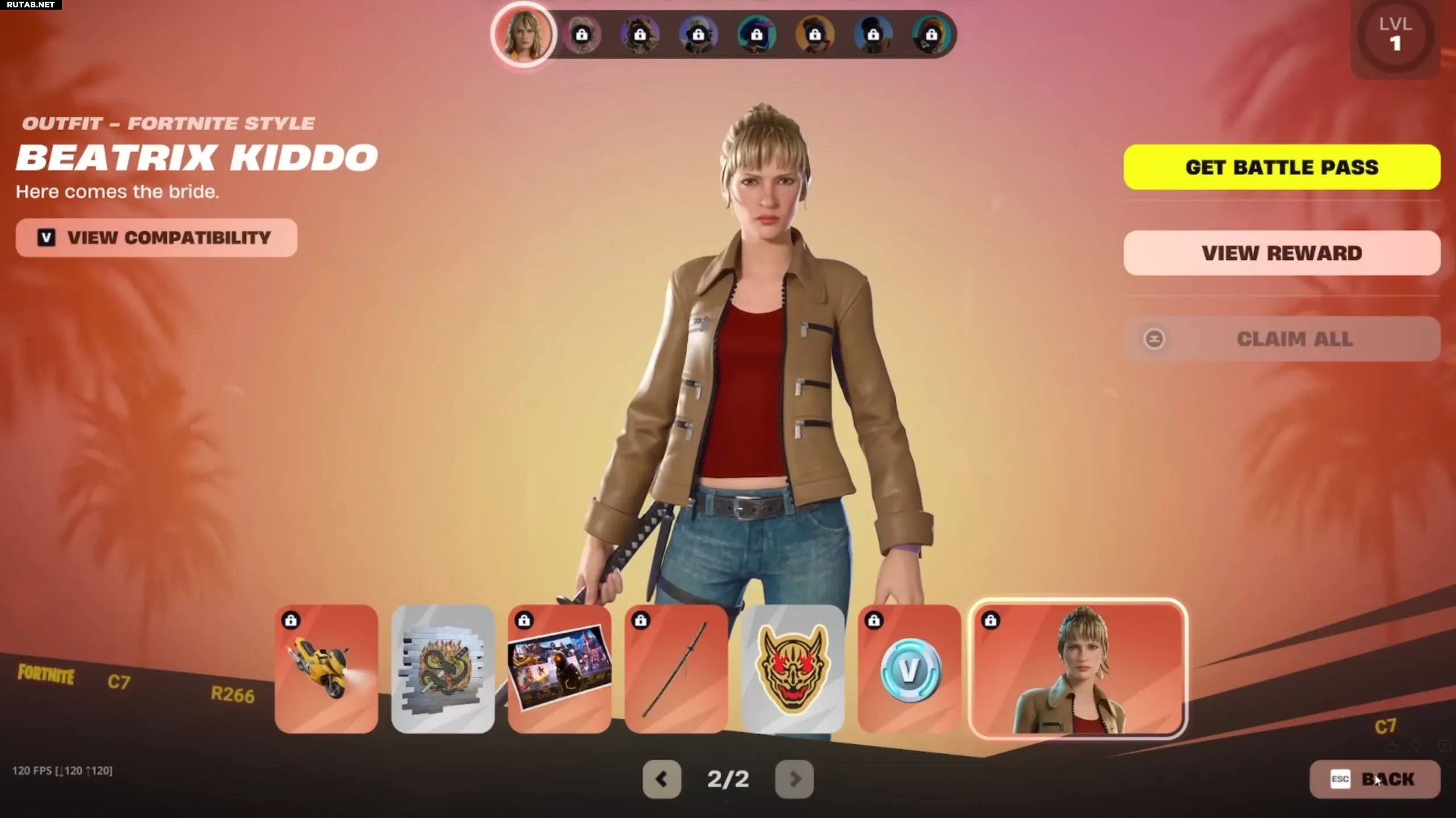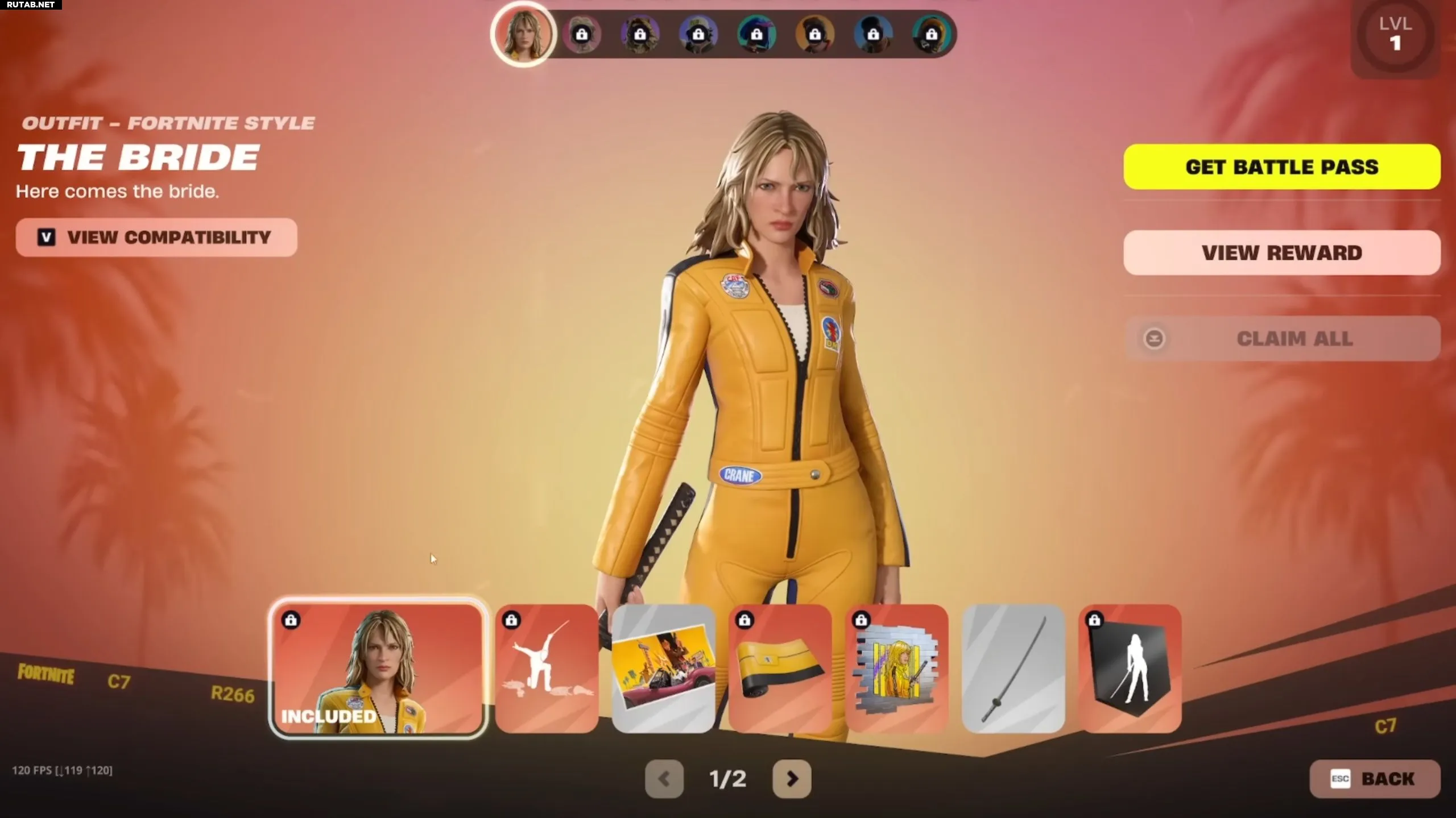 Скин Невеста — это коллаборация с фильмом «Убить Билла» (2003), где главную роль исполнила Ума Турман. Это первый скин, который вы получаете при покупке боевого пропуска Chapter 7 Season 1. Предметы из его набора можно начать открывать сразу же, используя токены уровней, в то время как для других скинов потребуется достичь 5-го уровня.