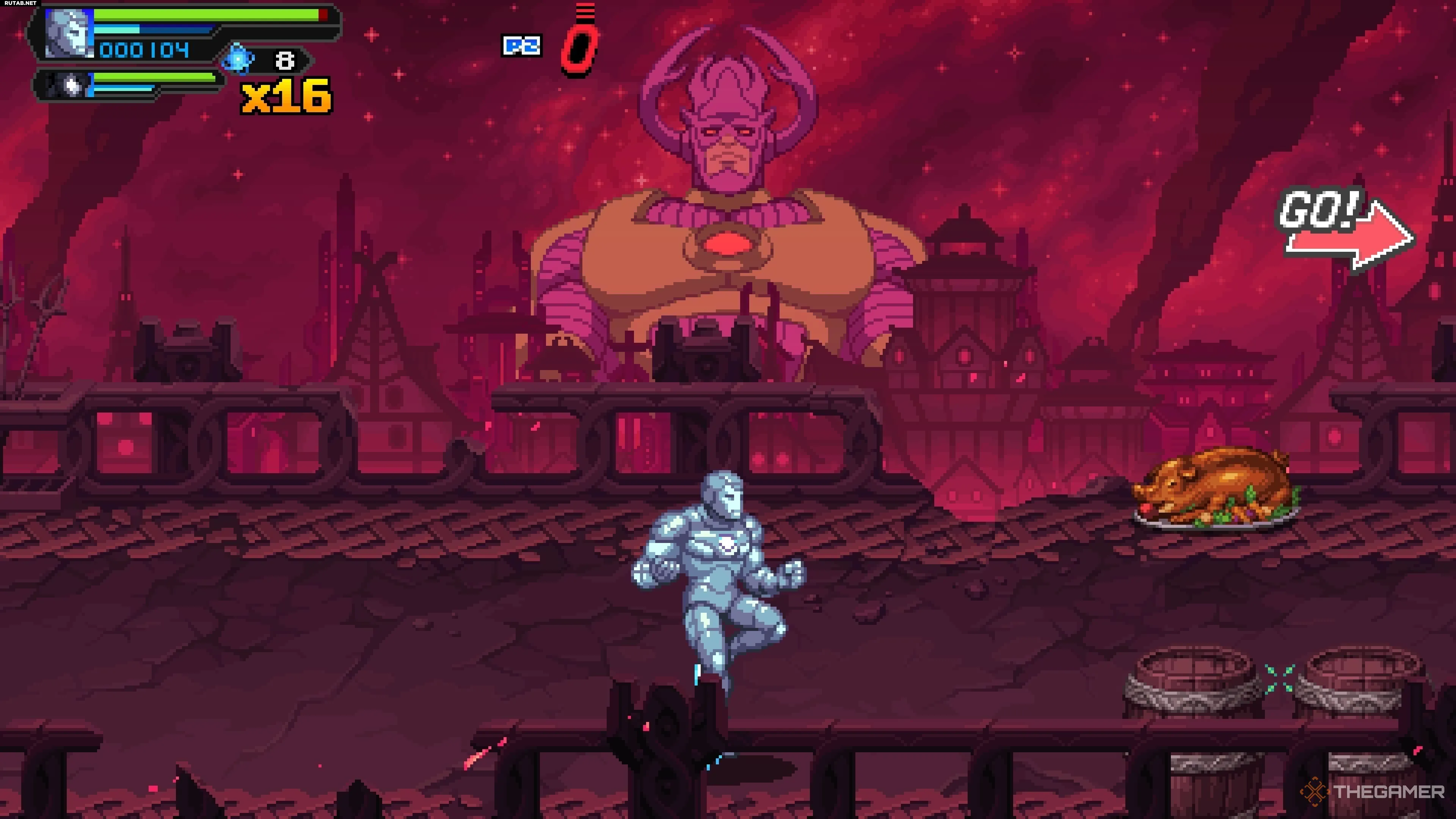 Можно подумать, что на финальном уровне Marvel Cosmic Invasion Куб будет спрятан особенно хитро, но это не так. В самом начале уровня вы попадёте на платформу, изображённую выше, с Башней Бакстера на заднем плане. Именно здесь, прямо посередине, скрывается последний Космический Куб в игре.