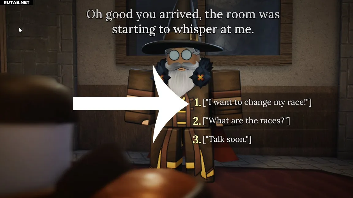 Идите по тропе до здания с башней. Войдите внутрь, и вы найдёте Волшебника. Подойдите к нему и нажмите кнопку для разговора. В диалоге выберите опцию «Я хочу изменить свою расу!».