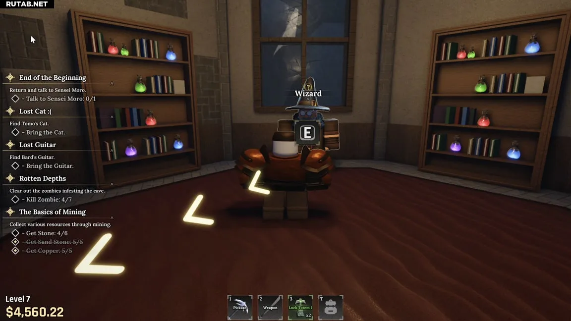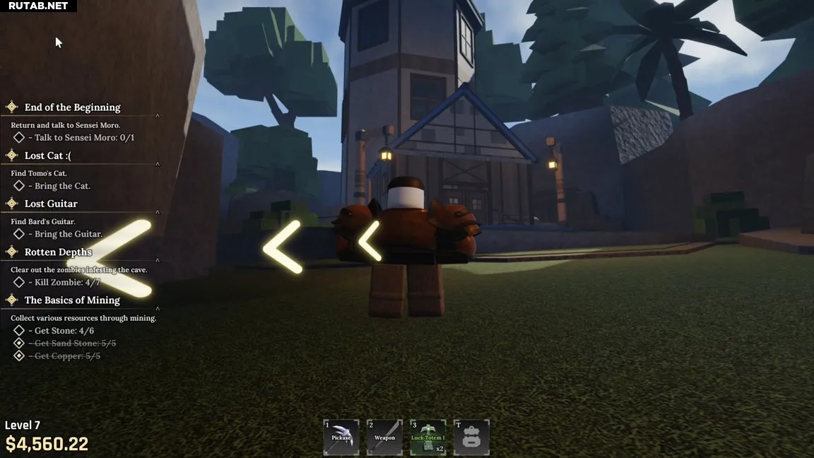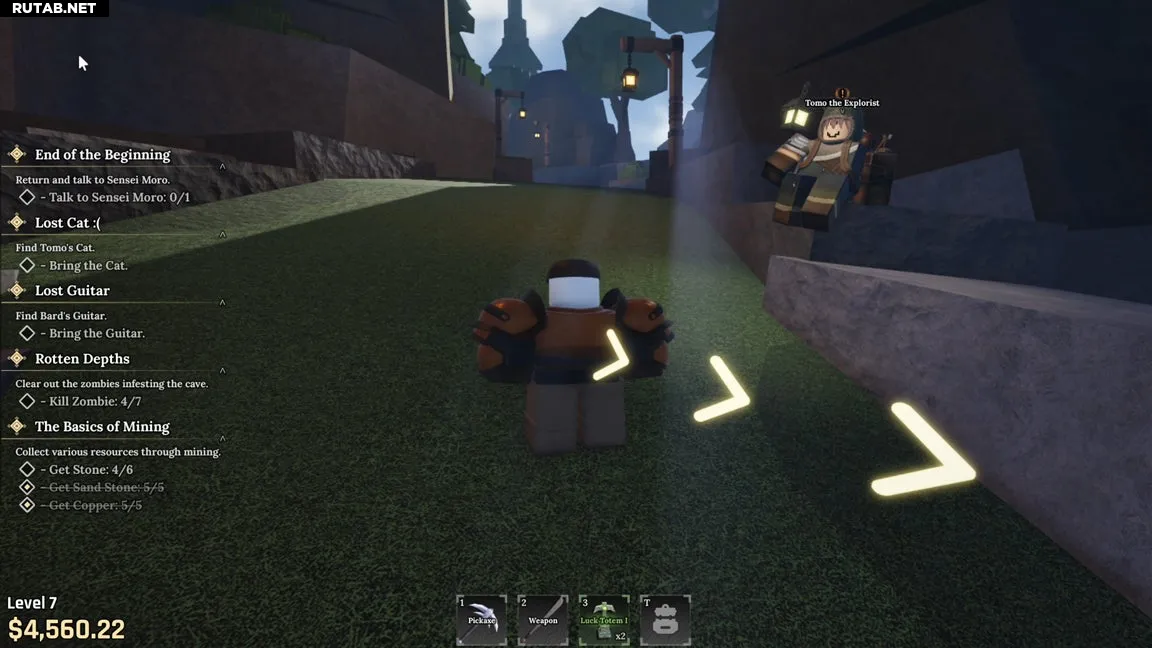 После создания персонажа покиньте точку спавна возле Сенсея Моро и наковальни. Направляйтесь к «Пещере», куда обычно ходят для добычи руды. Не заходя внутрь, сверните налево, пройдите мимо торговца Жадного Си и по тропинке, где сидит исследователь Томо.