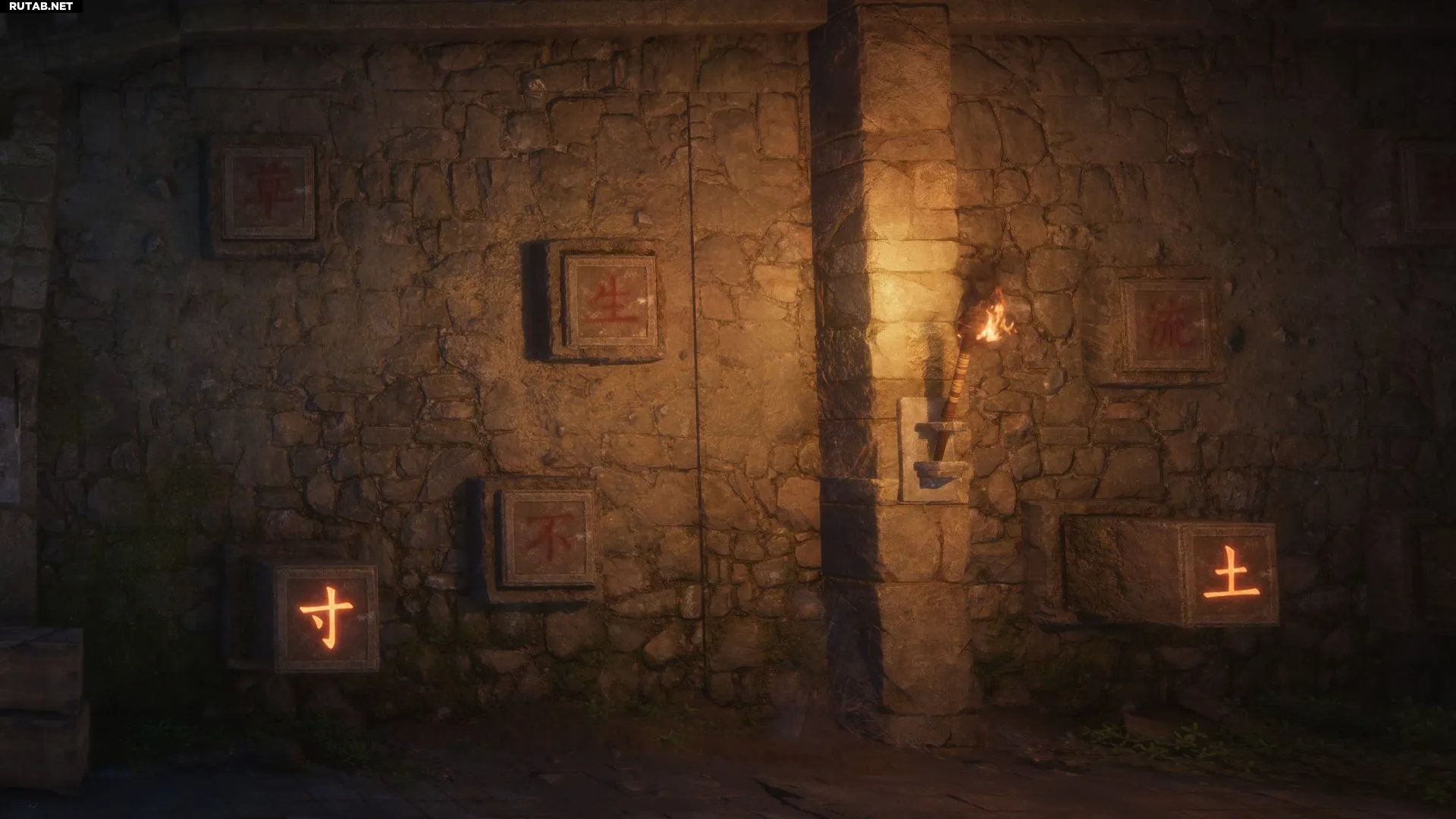 Спустившись в подземную камеру, вы увидите статую, окружённую стенами со светящимися китайскими иероглифами. Ваша задача — нажать на определённые блоки, чтобы на каждой стене остались светиться иероглифы, составляющие слова из Третьей улики (она лежит прямо перед этой комнатой).
