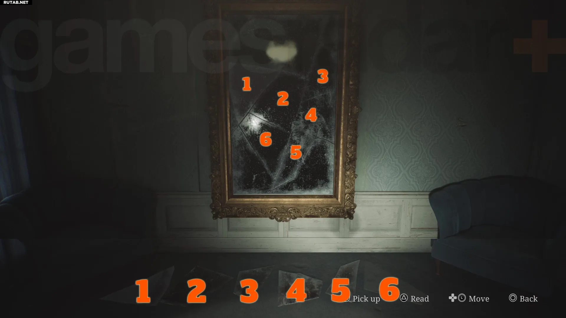 Головоломка с зеркалом решается как пазл: нужно правильно разместить все осколки. Один из кусков зеркала лежит в спальне позади вас — его нужно сначала подобрать.