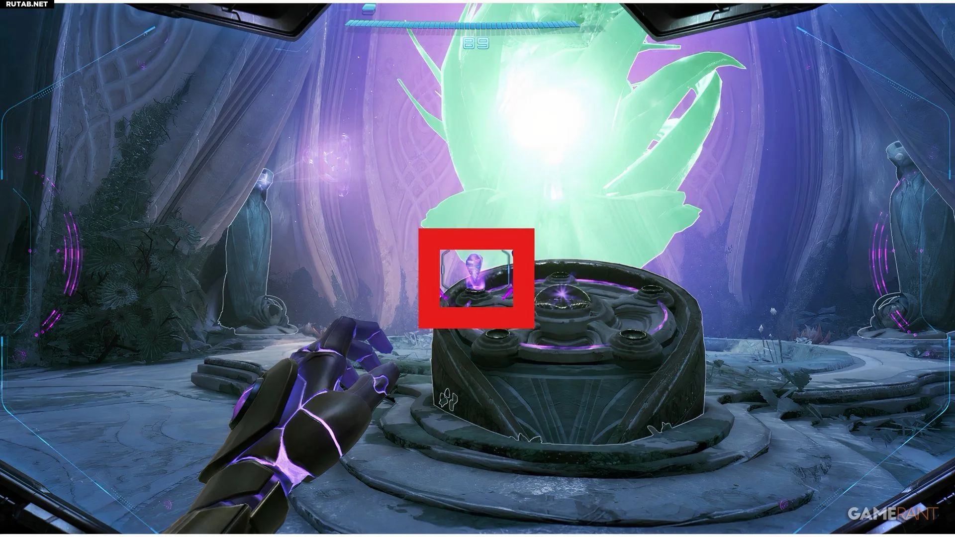 Посмотрите на вторую статую слева: в режиме Визора вы увидите пси-узел, который можно подобрать. Поместите узел в устройство в центре комнаты, а затем передвиньте светящийся фиолетовый кристалл в правильный слот (расположенный в положении «10 часов» в левом верхнем углу).